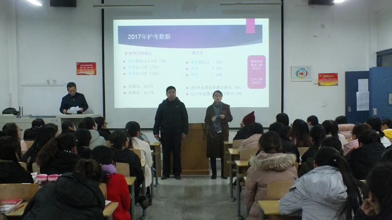 為了進(jìn)一步提高我系學(xué)生的專業(yè)水平和護(hù)考過(guò)關(guān)率,讓2018屆畢業(yè)生更好地應(yīng)對(duì)護(hù)士資格考試,12月20日晚,護(hù)理系在明遠(yuǎn)樓211教室舉辦了以護(hù)考為主題的講座,15級(jí)護(hù)理、助產(chǎn)專業(yè)共100余人聆聽(tīng)了此次講座。護(hù)理系黨總支書(shū)記張建輝、系主任韓曉萍參加講座并講話。