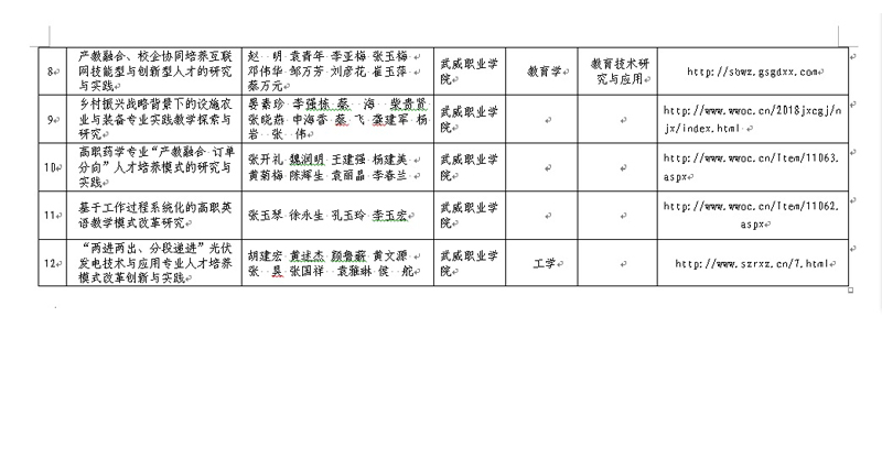 根據(jù)甘肅省人力資源和社會(huì)保障廳、甘肅省教育廳《關(guān)于開展2018年甘肅省職業(yè)教育教學(xué)成果獎(jiǎng)評(píng)選表彰工作的通知》精神,經(jīng)個(gè)人申報(bào),學(xué)院審核,決定擬推薦以下所提交紙質(zhì)材料、電子材料、申報(bào)網(wǎng)站等符合申報(bào)要求的12項(xiàng)教學(xué)成果參評(píng)2018年甘肅省職業(yè)教育教學(xué)成果獎(jiǎng),現(xiàn)予以公示。