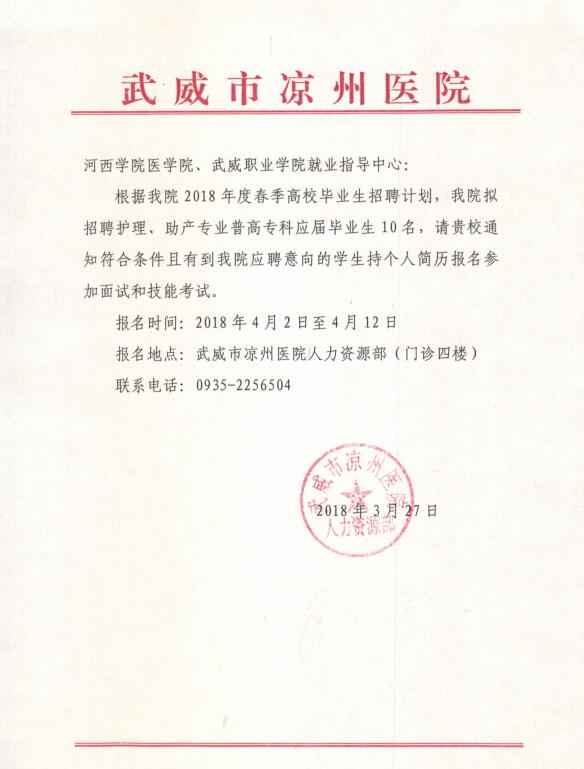 ? ? ? ?武威市涼州醫(yī)院擬招聘護理、助產專業(yè)畢業(yè)生10名,報名時間2018年4月2日~4月12日,報名時請攜帶個人簡歷,一寸彩色照片一張,請我系15級應屆畢業(yè)生積極響應,踴躍報名!
