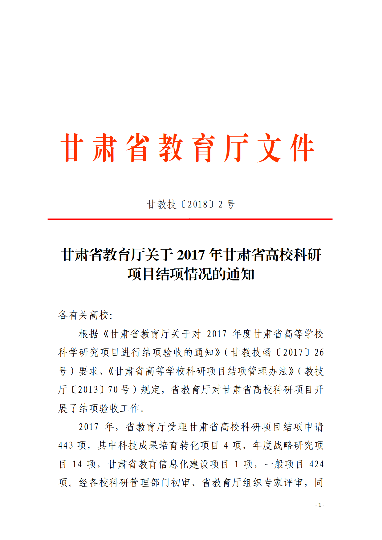 甘肅省教育廳關(guān)于2017年甘肅省高校科研項(xiàng)目結(jié)項(xiàng)情況的通知