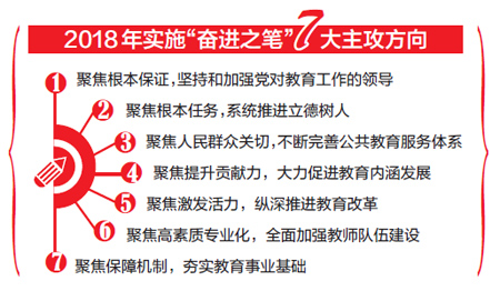 陳寶生指出,黨的十九大對教育工作作出了全面系統(tǒng)部署。在加快教育現(xiàn)代化、建設(shè)教育強國的新征程中,解決教育發(fā)展不平衡不充分的問題將是我們長期要面對的工作主題。要以問題為導(dǎo)向,將其作為實施“奮進之筆”的著力點和主攻方向。一是聚焦根本保證,堅持和加強黨對教育工作的領(lǐng)導(dǎo)。要把黨的政治建設(shè)擺在首位,狠抓大抓基層黨組織建設(shè),持之以恒正風肅紀,抓好意識形態(tài)工作。二是聚焦根本任務(wù),系統(tǒng)推進立德樹人。要把德育擺在更加重要的位置,堅定青少年理想信念,改進和加強思想政治工作,大力發(fā)展素質(zhì)教育,加強語言文字工作。三是聚焦人民群眾關(guān)切,不斷完善公共教育服務(wù)體系。要促進學前教育普惠健康發(fā)展,加快城鄉(xiāng)義務(wù)教育一體化發(fā)展步伐,加大普及高中階段教育攻堅力度,加大對困難地區(qū)扶持力度,切實加強校園安全。四是聚焦提升貢獻力,大力促進教育內(nèi)涵發(fā)展。要以質(zhì)量為本,持續(xù)推進職業(yè)教育質(zhì)量提升,健全高等教育內(nèi)涵發(fā)展政策機制,辦好繼續(xù)教育。五是聚焦激發(fā)活力,縱深推進教育改革。要深化“放管服”改革,實施考招改革“拓展深化”攻堅行動,支持和規(guī)范社會力量興辦教育,堅定不移以開放促改革。六是聚焦高素質(zhì)專業(yè)化,全面加強教師隊伍建設(shè)。實施教師隊伍“建設(shè)改革”攻堅行動,健全師德師風建設(shè)長效機制,完善教師管理制度,提升教師獲得感、幸福感和榮譽感。七是聚焦保障機制,夯實教育事業(yè)基礎(chǔ)。要落實教育投入責任,加快教育信息化步伐,全力推進依法治教。