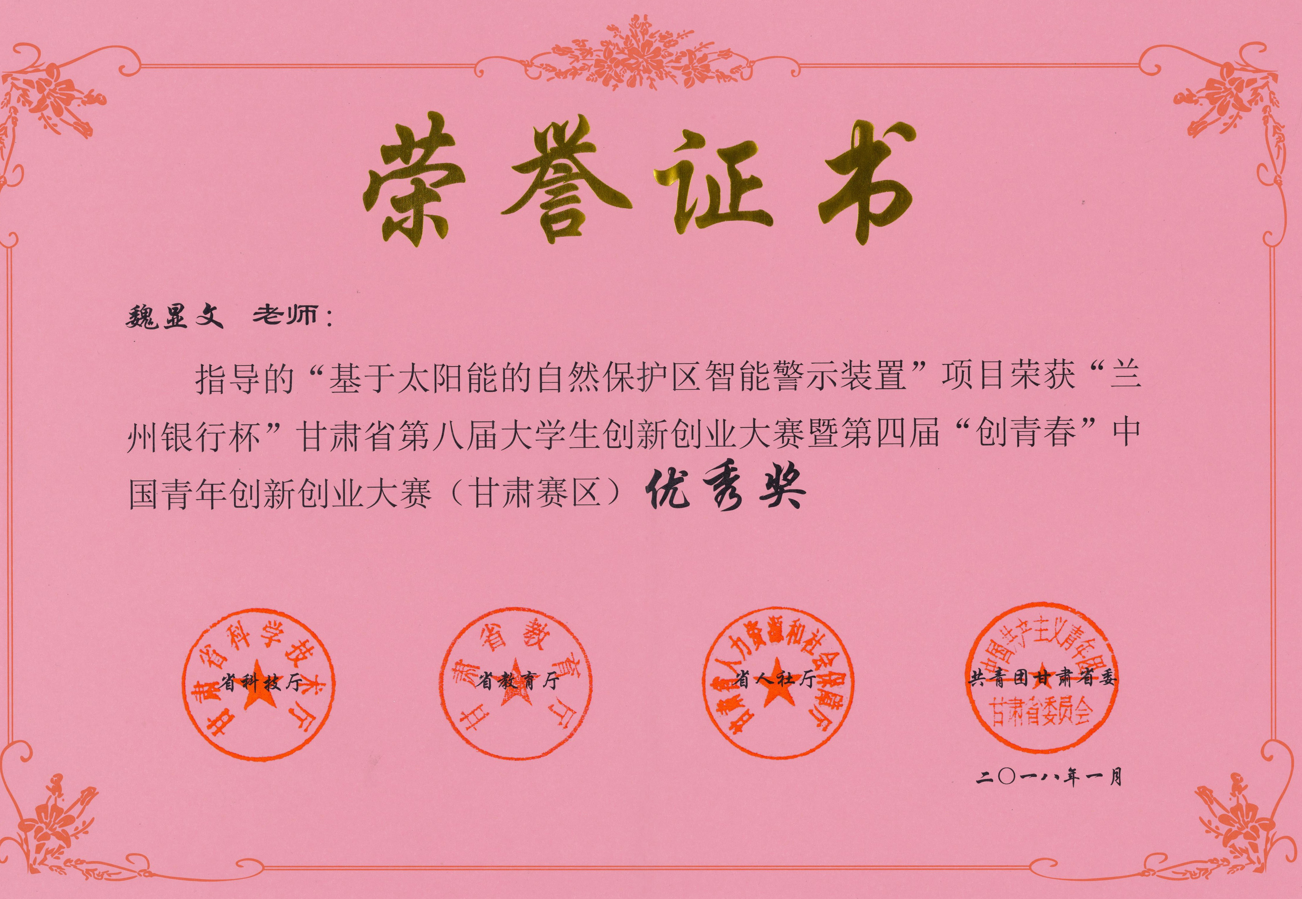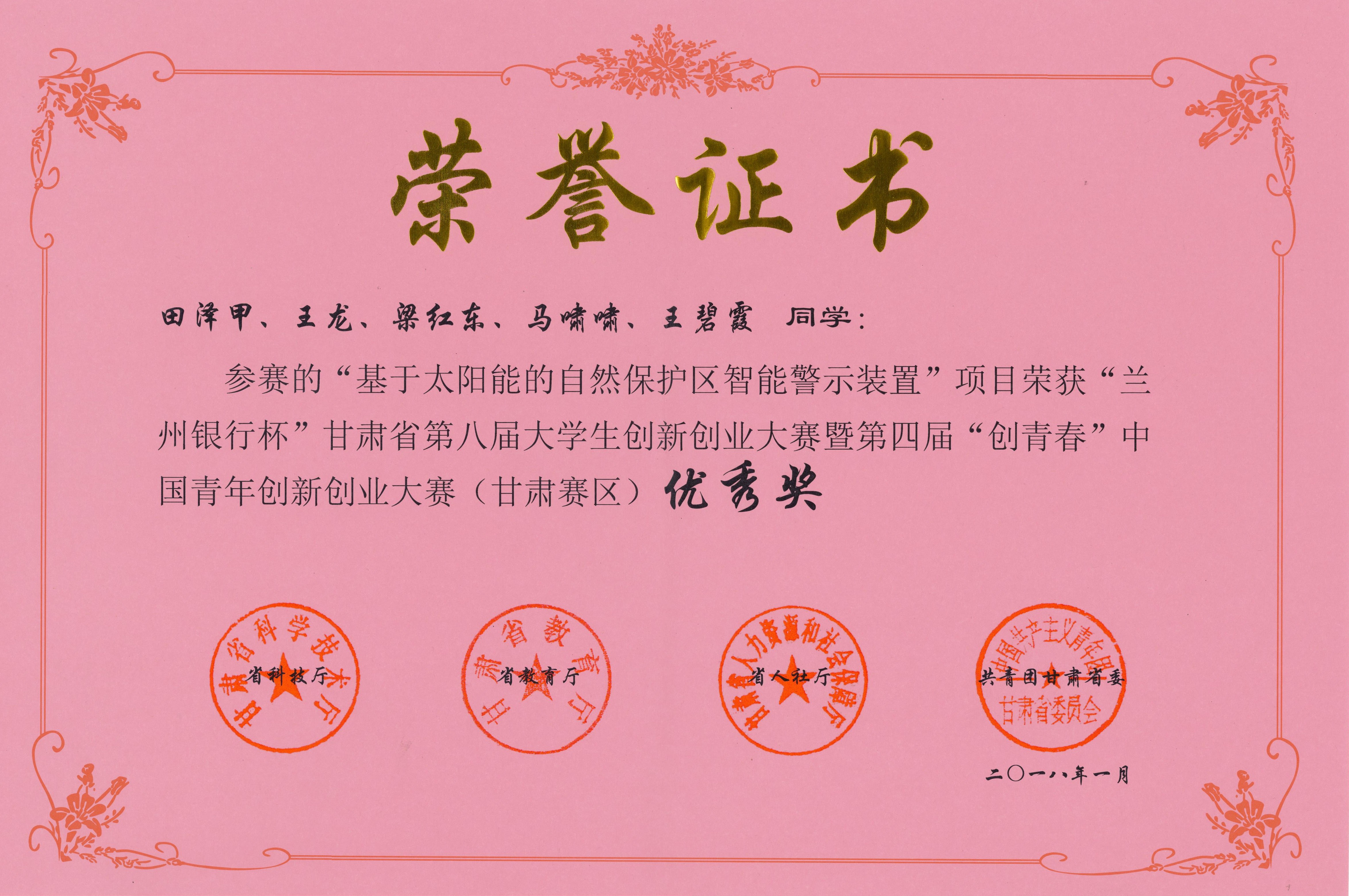 近日,從省教育廳、省科技廳、省人力資源和社會保障廳、共青團甘肅省委聯(lián)合下發(fā)的《關(guān)于公布“蘭州銀行杯”甘肅省第八屆大學(xué)生創(chuàng)新創(chuàng)業(yè)大賽暨第四屆“創(chuàng)青春”中國青年創(chuàng)新創(chuàng)業(yè)大賽(甘肅賽區(qū))獲獎名單的通知》中獲知,在今年1月7日舉辦的“蘭州銀行杯”甘肅省第八屆大學(xué)生創(chuàng)新創(chuàng)業(yè)大賽暨第四屆“創(chuàng)青春”中國青年創(chuàng)新創(chuàng)業(yè)大賽(甘肅賽區(qū))中,我院選送的“基于太陽能的自然保護區(qū)智能警示裝置”項目獲得優(yōu)秀獎。