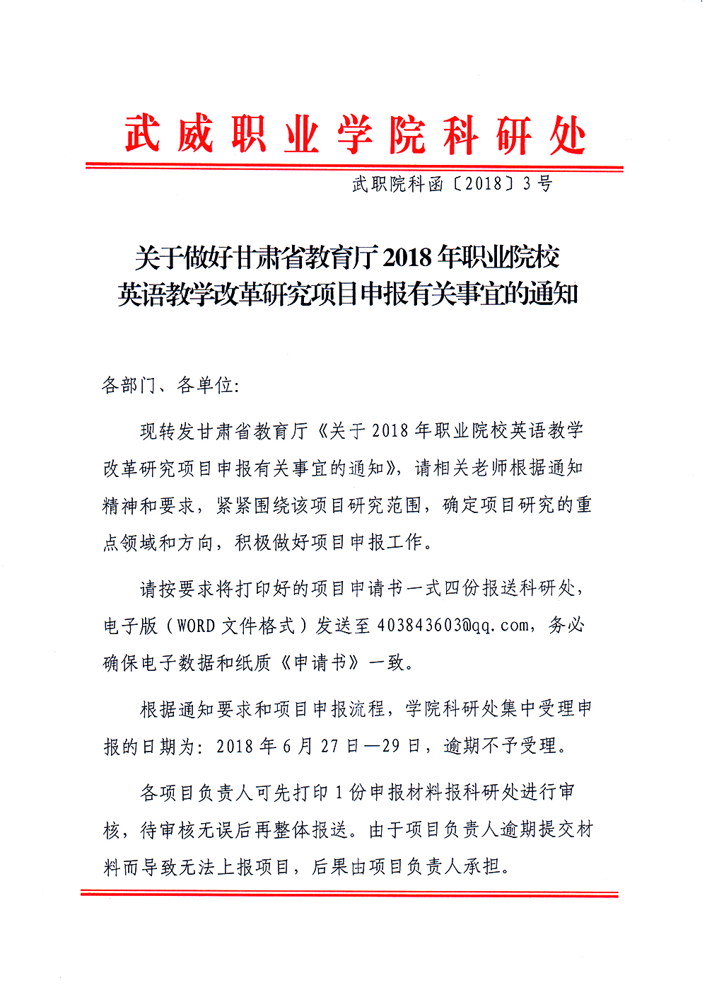 武職院科函〔2018〕3號——關(guān)于做好甘肅省教育廳2018年職業(yè)院校英語教學(xué)改革研究項(xiàng)目申報(bào)有關(guān)事宜的通知