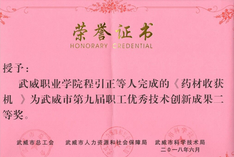 近日,武威市總工會、武威市人力資源和社會保障局、武威市科學技術(shù)局在全市企事業(yè)單位和廣大職工中廣泛開展了征集評選職工優(yōu)秀技術(shù)創(chuàng)新成果活動。經(jīng)過逐級推薦、專家評審、網(wǎng)絡(luò)公示等程序,我系教師程引正等完成的《藥材收獲機》喜獲武威市第九屆職工優(yōu)秀技術(shù)創(chuàng)新成果二等獎。