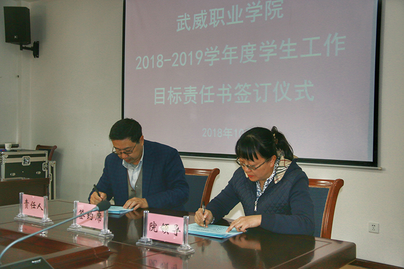 責(zé)任書簽訂儀式上,田迎春代表學(xué)院與各系黨總支書記或負(fù)責(zé)人簽訂了《武威職業(yè)學(xué)院2018-2019學(xué)年度學(xué)生工作目標(biāo)責(zé)任書》。她充分肯定了各系2017-2018學(xué)年的學(xué)生工作,并就我院學(xué)生工作提出了具體要求,一是學(xué)生工作要緊緊圍繞“立德樹人”的根本任務(wù),樹立全院全員育人思想,各系要強(qiáng)化學(xué)生工作管理責(zé)任,增強(qiáng)工作主動(dòng)性和責(zé)任性,使學(xué)生管理的各項(xiàng)工作更細(xì)、更實(shí);二是各系要在學(xué)生思想政治教育和日常管理工作中堅(jiān)持誰(shuí)主管誰(shuí)負(fù)責(zé)的原則,力求做到“工作規(guī)范化、管理精細(xì)化、服務(wù)人性化”;三是各系及學(xué)工部門在思想上要與學(xué)院保持高度一致,在工作落實(shí)上與學(xué)院保持相向而行,切實(shí)將目標(biāo)責(zé)任書的承諾轉(zhuǎn)化為抓工作、謀發(fā)展、促改革的具體行動(dòng);四是要在就業(yè)創(chuàng)業(yè)上下功夫,促進(jìn)畢業(yè)生就業(yè)率有所提高、就業(yè)質(zhì)量不斷上升;五是各系要繼續(xù)發(fā)揚(yáng)勇于創(chuàng)新、開拓進(jìn)取的精神,以更飽滿的熱情、更昂揚(yáng)的斗志、更務(wù)實(shí)的作風(fēng)推進(jìn)我院學(xué)生管理工作的科學(xué)發(fā)展。