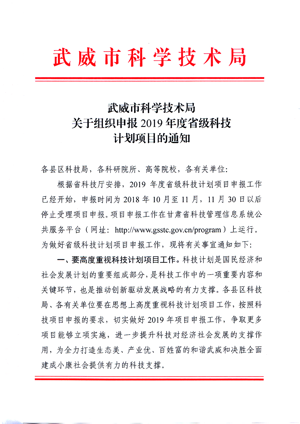轉(zhuǎn)發(fā)武威市科學(xué)技術(shù)局關(guān)于組織申報(bào)2019年度省級科技計(jì)劃項(xiàng)目的通知