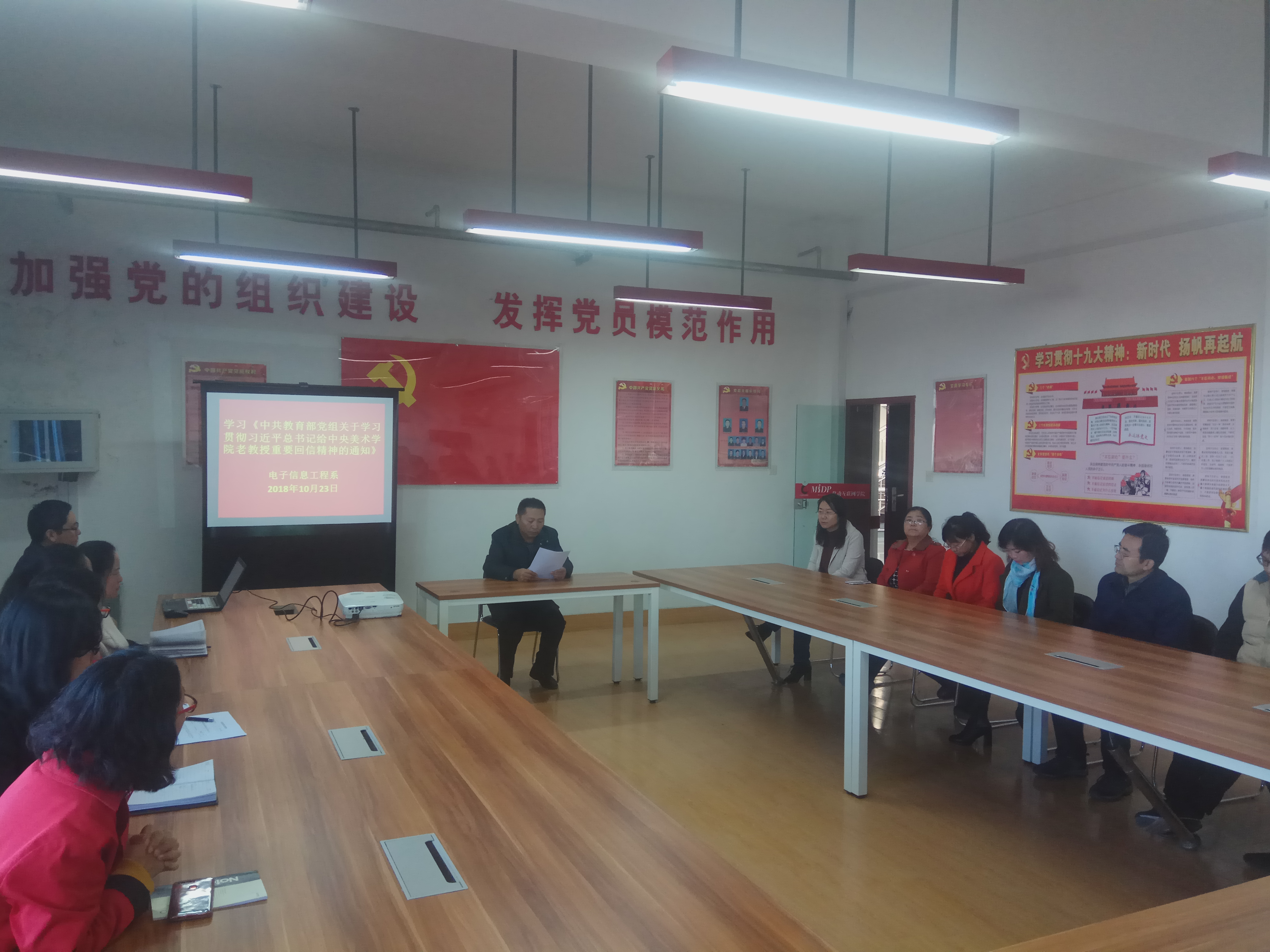 根據(jù)學院組織人事處轉發(fā)《中共教育部黨組關于學習貫徹習總書記給中央美術學院老教授重要回信精神的通知》的通知要求,電子信息工程系于10月23日召開教職工大會,開展對習近平總書記回信精神的學習。