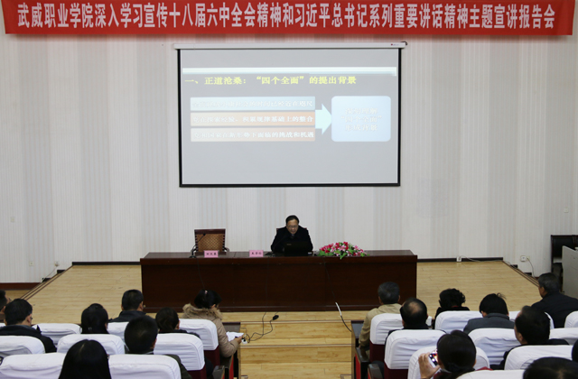 根據(jù)省委和全省宣傳工作會(huì)議關(guān)于在全省組織開展深入學(xué)習(xí)宣傳十八屆五中全會(huì)精神和習(xí)近平總書記系列重要講話精神主題宣講活動(dòng)的通知要求,為向全院黨員干部和師生宣傳好、解讀好十八屆五中、六中全會(huì)精神和習(xí)近平總書記系列重要講話的實(shí)質(zhì)內(nèi)涵和深遠(yuǎn)意義,將全會(huì)精神和總書記系列重要講話精神作為指導(dǎo)和推動(dòng)學(xué)院各項(xiàng)事業(yè)快速發(fā)展的科學(xué)理論和強(qiáng)大動(dòng)力。10月29日上午,“武威職業(yè)學(xué)院深入學(xué)習(xí)宣傳十八屆五中、六中全會(huì)精神和習(xí)近平總書記系列重要講話精神主題宣講報(bào)告會(huì)”在學(xué)院尚德樓正德廳舉行。會(huì)議邀請(qǐng)省委講師團(tuán)成員、蘭州大學(xué)馬克思主義學(xué)院博士生導(dǎo)師王學(xué)儉教授蒞臨學(xué)院,作題為“四個(gè)全面”戰(zhàn)略布局解讀的宣講報(bào)告。學(xué)院黨委副書記趙明,副院長王永緒、潘玉華、田迎春,全體中層干部,各部門師生代表共計(jì)260余人參加宣講報(bào)告會(huì)。報(bào)告會(huì)由田迎春主持。