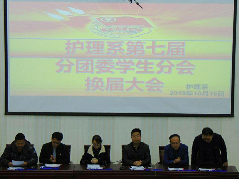 近日護理系分團委學生分會第七屆換屆選舉于正德廳順利召開,護理系黨總支書記張建輝、系主任韓曉萍、系分團委書記楊杰、輔導員寇明赟、張前、龐大勇,2017級、2018級團干部出席了本次大會。