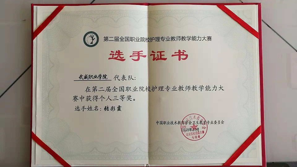 競賽共分為理論考核、說課程和臨床護理技能操作三個部分。其中,臨床護理技能操作部又分為三項,心肺復(fù)蘇術(shù)和靜脈輸液操作技術(shù)為必選項目,置胃管技術(shù)和氣管切開護理技術(shù)為抽選項目。經(jīng)過三天緊張激烈的比拼,通過了全部考核內(nèi)容的綜合評定,最終張彩霞老師獲得了三等獎。