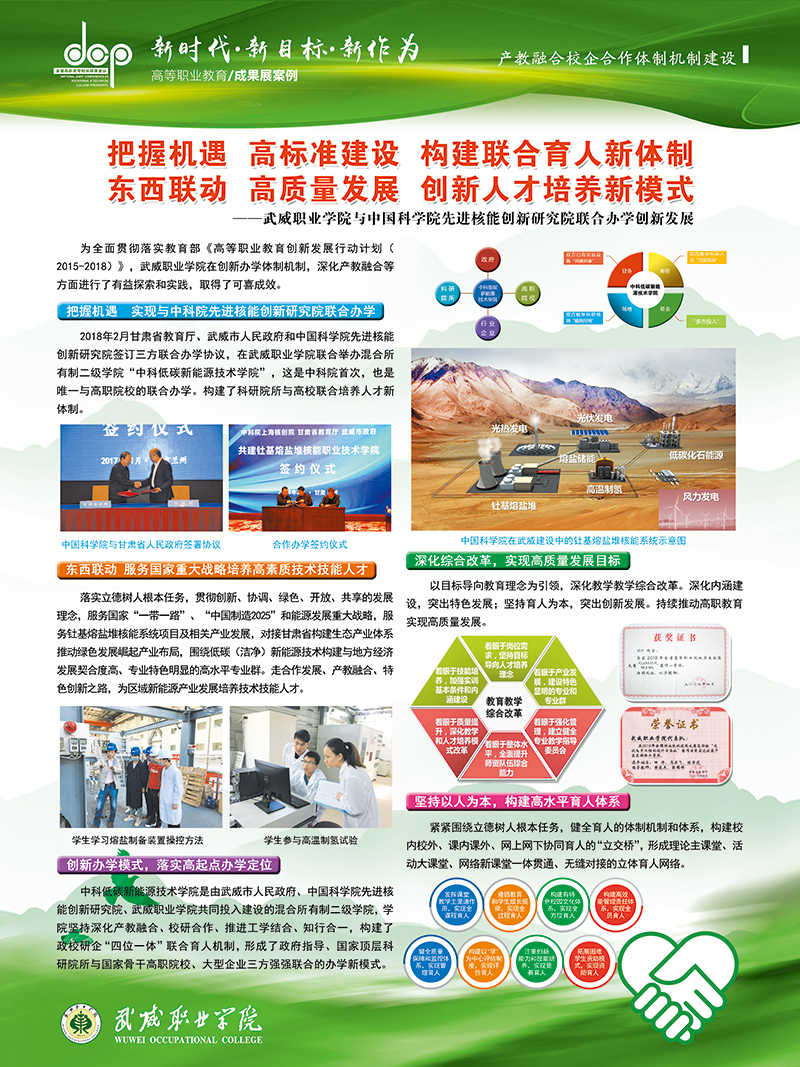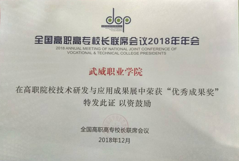 12月8日至9日,學院黨委書記、院長趙明教授、副院長翟存祥教授帶隊參加了在福建福州召開的全國高職高專校長聯(lián)席會議2018年年會。學院自主研發(fā)的“光伏組件智能清潔裝置”榮獲高職院校技術(shù)研發(fā)與應用成果 “優(yōu)秀成果獎”(全國僅36所高職院校獲此殊榮,甘肅省僅2所),“學院與中科院先進核能創(chuàng)新研究院聯(lián)合辦學創(chuàng)新發(fā)展”案例入選教育成果案例展。
