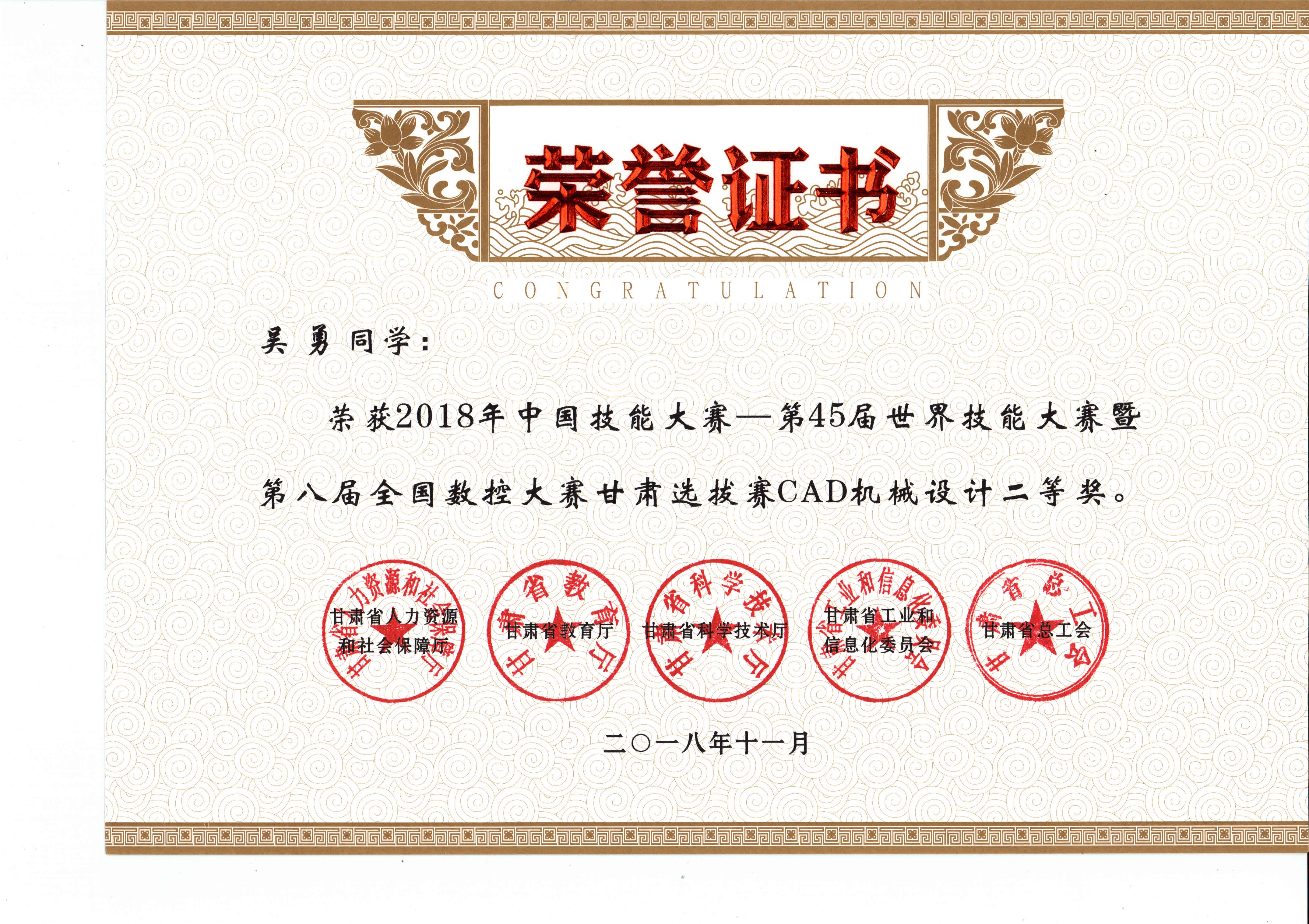 2018年中國(guó)技能大賽--第45屆世界技能大賽暨第八屆全國(guó)數(shù)控大賽甘肅選拔賽(CAD機(jī)械設(shè)計(jì)項(xiàng)目)獲獎(jiǎng)證書