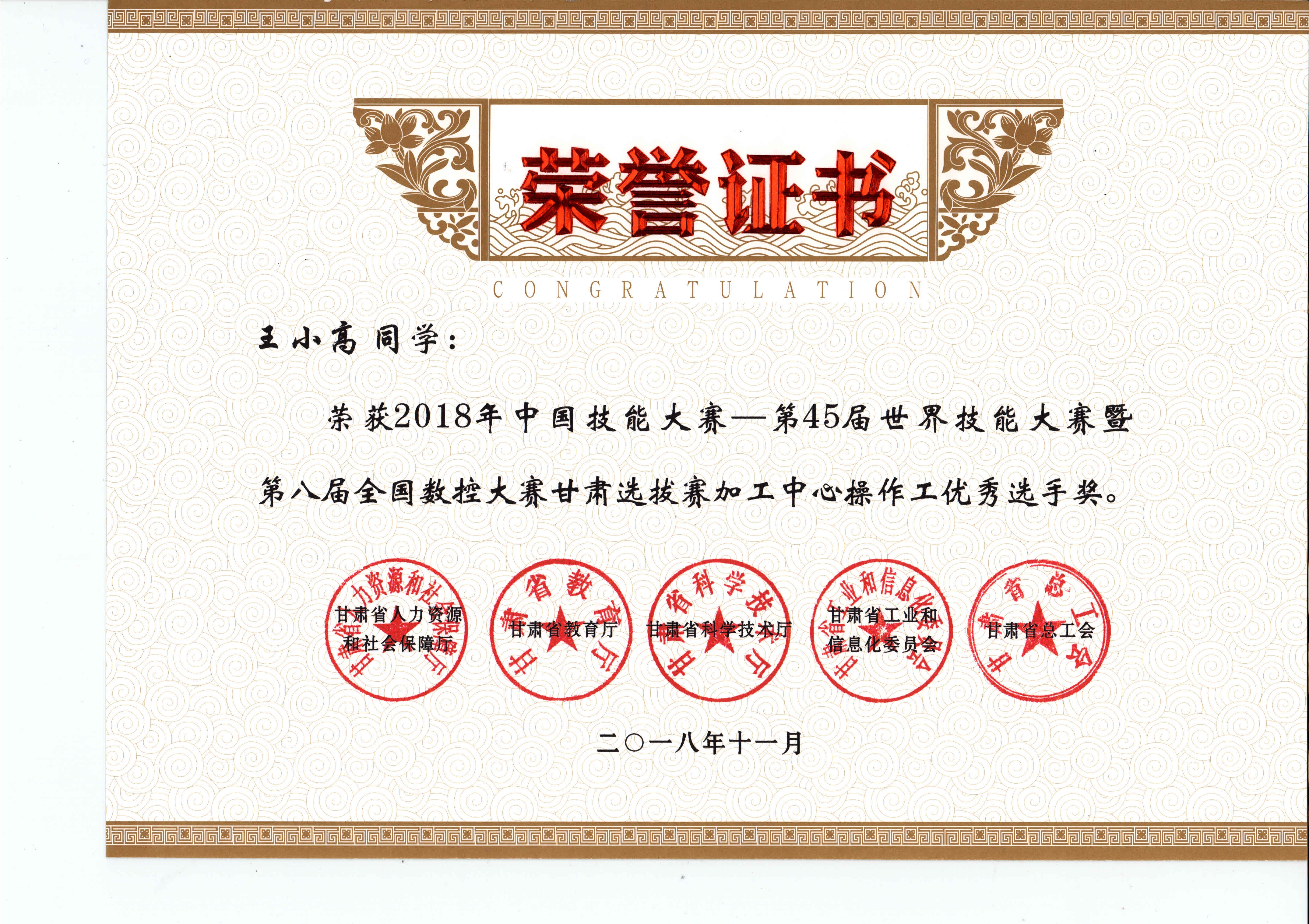 2018年中國技能大賽--第45屆世界技能大賽暨第八屆全國數控大賽甘肅選拔賽(加工中心項目)獲獎證書