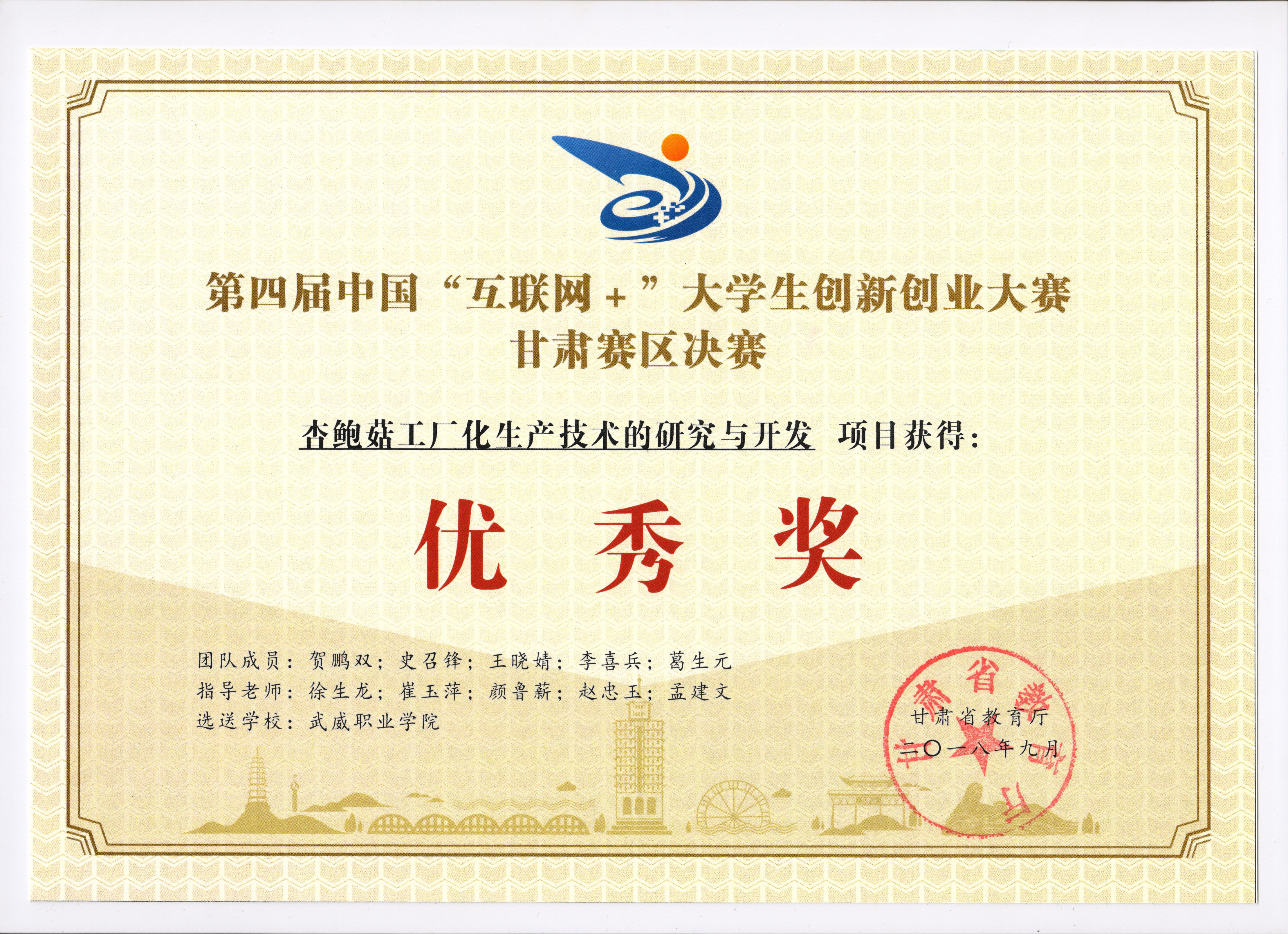 《杏鮑菇工廠化生產(chǎn)技術(shù)的研究與開發(fā)》項(xiàng)目榮獲第四屆中國“互聯(lián)網(wǎng)+”大學(xué)生創(chuàng)新創(chuàng)業(yè)大賽甘肅賽區(qū)優(yōu)秀獎