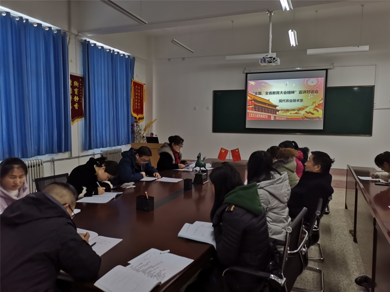 12月24日,現代農業(yè)技術系在行書樓教學區(qū)309辦公室召開宣講“全國、全省教育大會精神”。宣講對談會由系黨總支書記晏素珍主持,全系教師參加并發(fā)言交流教育大會精神。
