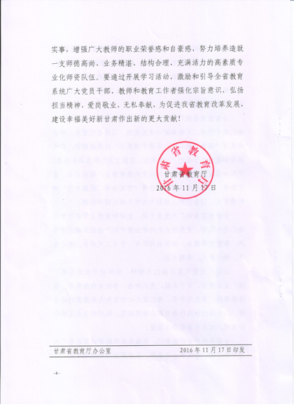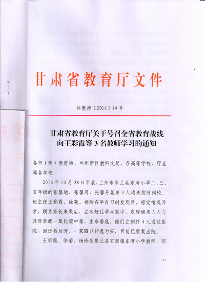 現(xiàn)將《甘肅省教育廳關(guān)于號(hào)召全省教育戰(zhàn)線向王彩霞等3名教師學(xué)習(xí)的通知》復(fù)印給你們,請(qǐng)認(rèn)真組織所屬教職工學(xué)習(xí)王彩霞、徐菊 、楊玲3名教師愛(ài)崗敬業(yè)、無(wú)私奉獻(xiàn)、愛(ài)心救人的先進(jìn)事跡。積極在院團(tuán)委、系團(tuán)總支,輔導(dǎo)員和班主任等學(xué)生管理隊(duì)伍中展開學(xué)習(xí)研討活動(dòng),深入踐行社會(huì)主義核心價(jià)值觀,切實(shí)加強(qiáng)學(xué)院意識(shí)形態(tài)領(lǐng)域工作,唱響主旋律,大力弘揚(yáng)正能量。