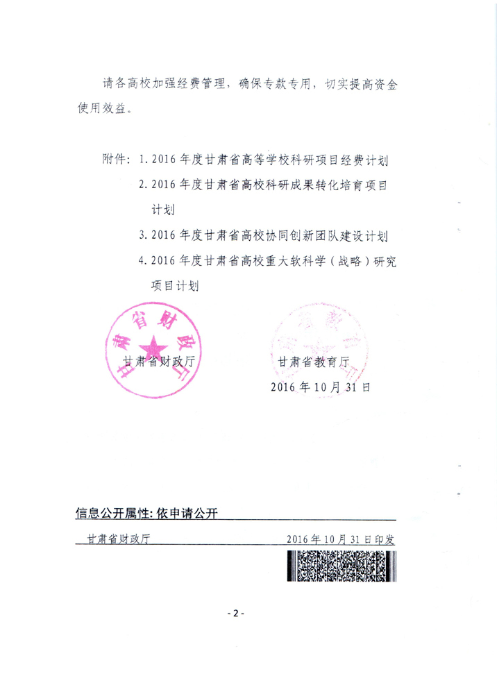 轉(zhuǎn)發(fā)甘肅省財(cái)政廳 教育廳文件 關(guān)于下達(dá)2016年度高校導(dǎo)師科研經(jīng)費(fèi)和“2011計(jì)劃”補(bǔ)助經(jīng)費(fèi)的通知