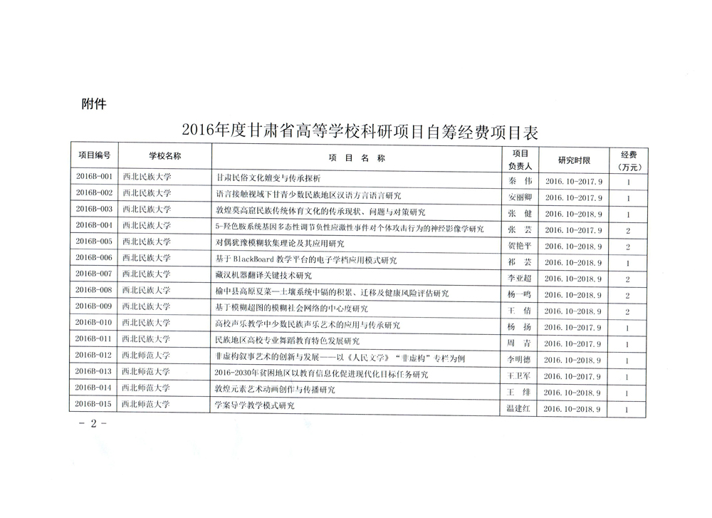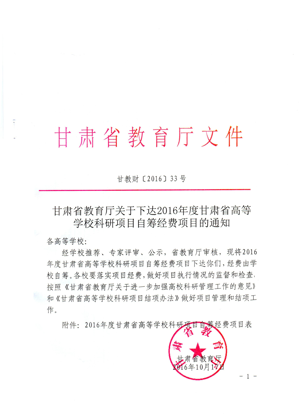 轉(zhuǎn)發(fā)甘肅省財(cái)政廳 教育廳文件 關(guān)于下達(dá)2016年度甘肅省高等學(xué)校科研項(xiàng)目自籌經(jīng)費(fèi)項(xiàng)目的通知