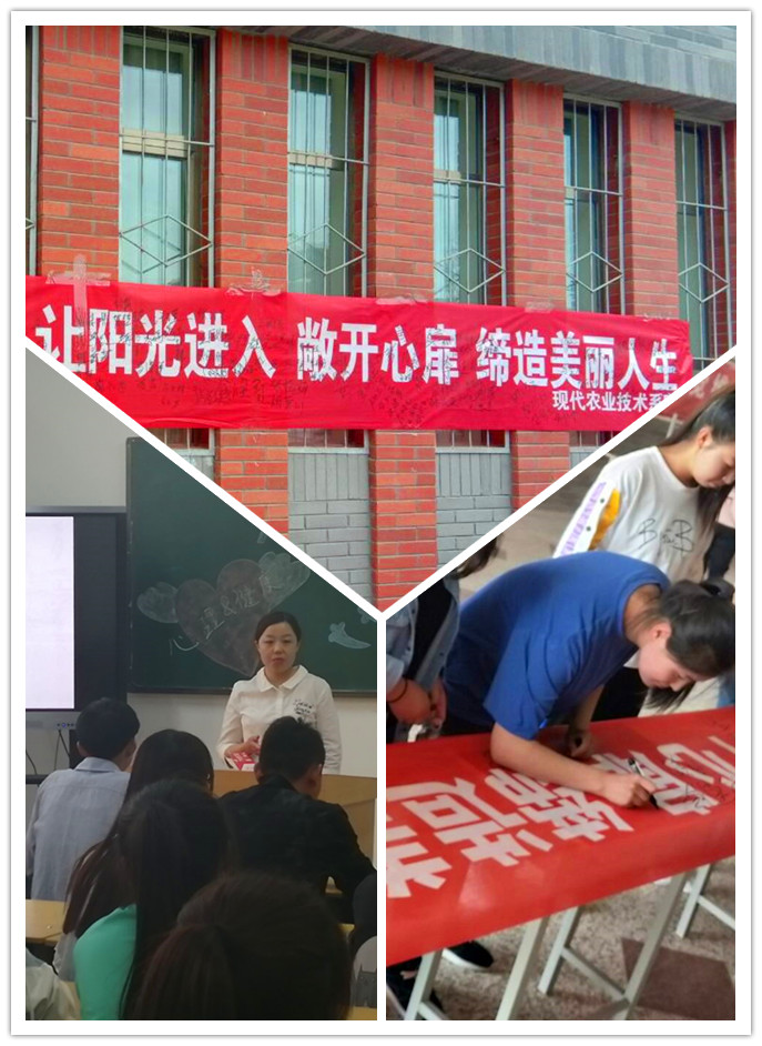 邀請(qǐng)現(xiàn)代農(nóng)業(yè)技術(shù)系張曉燕老師做了題為《預(yù)見未知的自己》的講座;系團(tuán)學(xué)會(huì)組織學(xué)生參加“打開心靈的窗戶,讓陽光進(jìn)入;敞開心扉,締造美麗人生?!敝黝}簽名活動(dòng)。各班召開心理健康主題班會(huì)、開展心理游戲和手抄報(bào)活動(dòng)。