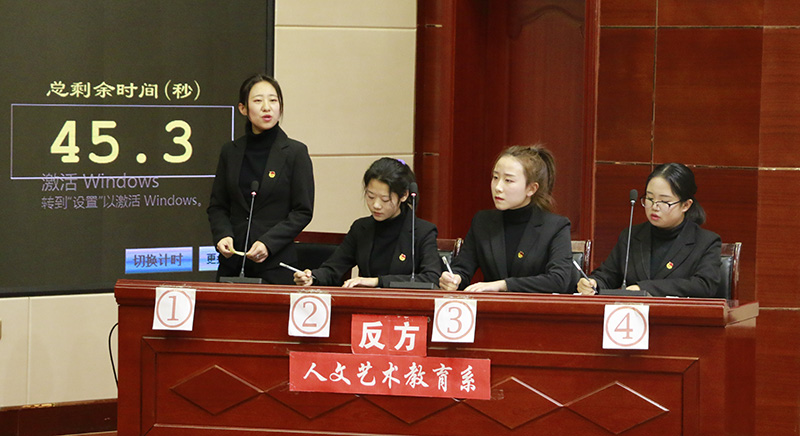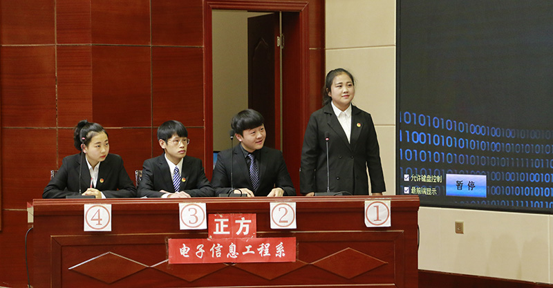 為慶祝中華人民共和國成立70周年,深入推進“不忘初心、牢記使命”主題教育活動扎實開展,進一步豐富校園文化生活,拓展大學(xué)生思辨能力,培養(yǎng)同學(xué)們的團隊合作精神,提高學(xué)生綜合素質(zhì),展現(xiàn)青年學(xué)生昂揚向上的青春風采和精神風貌,院團委舉辦了學(xué)院第十一屆大專辯論賽。12月24日晚,辯論賽決賽在大學(xué)生活動中心菁英廳舉行,200多名師生觀看了比賽。