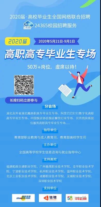 為了進(jìn)一步促進(jìn)2020屆高職高專畢業(yè)生就業(yè),教育部高校學(xué)生司和職業(yè)教育與成人教育司聯(lián)合推出“高職高專畢業(yè)生專場(chǎng)招聘會(huì)”,首批推出崗位超過(guò)50萬(wàn)個(gè)。畢業(yè)生可登錄教育部大學(xué)生就業(yè)網(wǎng)(新職業(yè)網(wǎng)www.ncss.cn)或直接掃描宣傳頁(yè)中的二維碼參與活動(dòng)。