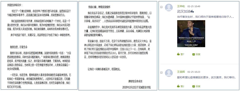 《中華優(yōu)秀傳統(tǒng)文化》課程團(tuán)隊(duì)的馮文娟老師在開學(xué)第一天借助在線教學(xué)平臺(tái)向?qū)W生推送了《致2019級(jí)學(xué)生的一封信》,激勵(lì)學(xué)生要敬畏自然、珍愛生命,致敬英雄、感恩榜樣,寬闊心胸、厚植家國(guó)情懷。信中這樣寫道:“在疫情防控中,我們無時(shí)無刻不在感受國(guó)家的力量,正因?yàn)橛羞@樣強(qiáng)大的力量,讓我們?cè)诶щy面前堅(jiān)守責(zé)任,無私奉獻(xiàn),眾志成城,充滿信心地迎接戰(zhàn)勝疫情的勝利曙光?!薄?家是最小國(guó),國(guó)是千萬家。在這個(gè)沒有硝煙的戰(zhàn)場(chǎng),建造武漢火神山、雷神山醫(yī)院的中國(guó)速度,證明了我們擁有戰(zhàn)勝疫情的強(qiáng)大力量;捐資捐物,證明了我們有打贏疫情阻擊戰(zhàn)的中國(guó)精神;全國(guó)人民上下一心,自我隔離,更體現(xiàn)了我們共同戰(zhàn)勝困難的堅(jiān)定決心。春天已到,歷經(jīng)苦寒依舊傲然的梅花,定將帶著勝利的消息和沁人的花香一同到來?!蓖瑫r(shí),為學(xué)生推送由央視頻和有道精品課共同錄制的《面對(duì)疫情教你如何有效防范》疫情防控專題視頻,與學(xué)生一起為打贏新冠肺炎疫情防控阻擊戰(zhàn)貢獻(xiàn)力量。