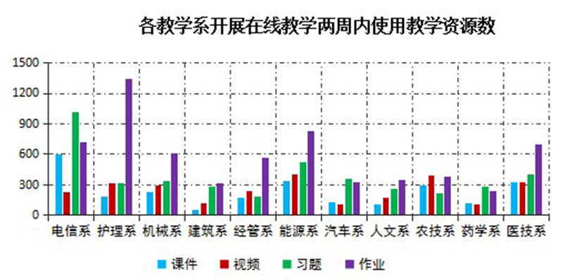 開展在線教學(xué)兩周以來,通過學(xué)院在線教學(xué)平臺(tái)管理后臺(tái)數(shù)據(jù)整理分析,教師為在線授課準(zhǔn)備了充足的教學(xué)資源。兩周內(nèi),學(xué)院教學(xué)平臺(tái)新上傳教學(xué)課件2527個(gè),教學(xué)視頻2701個(gè);新設(shè)置課堂練習(xí)題4176道,發(fā)布課后作業(yè)題6375道,豐富的資源有力支持在線教學(xué)順利進(jìn)行。