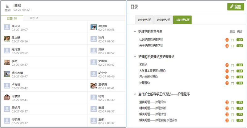 根據(jù)教學(xué)實(shí)際,護(hù)理制定了線上教學(xué)工作方案,對(duì)線上教學(xué)工作做出統(tǒng)一安排,強(qiáng)調(diào)了線上教學(xué)督導(dǎo)、任課教師和班主任的具體工作職責(zé)。2月24日,各項(xiàng)教學(xué)工作有序開展。共24名教師完成 11門課程的在線教學(xué)任務(wù),主要依托學(xué)院在線教學(xué)平臺(tái)、中國(guó)大學(xué)MOOC、人衛(wèi)慕課、智慧職教平臺(tái)上完成授課,上課學(xué)生1510人。通過多層次多方位的監(jiān)控?cái)?shù)據(jù)分析,全系在線教學(xué)整體運(yùn)行平穩(wěn)有序,管理人員組織管理到位,教師盡職盡責(zé),課堂授課方式靈活多樣,學(xué)生積極互動(dòng),在線教學(xué)課堂效果良好,達(dá)到預(yù)期。學(xué)生平均到課率達(dá)到99%以上,積極落實(shí)了在線教學(xué)對(duì)學(xué)生“全覆蓋”的要求。教師在教學(xué)平臺(tái)上完成視頻、電子教材、PPT等資源上傳,積極開展課前預(yù)習(xí)、主題討論、隨堂測(cè)驗(yàn)、作業(yè)布置等各類線上課堂教學(xué)活動(dòng),充分調(diào)動(dòng)學(xué)生的學(xué)習(xí)主動(dòng)性,學(xué)習(xí)效果良好。
