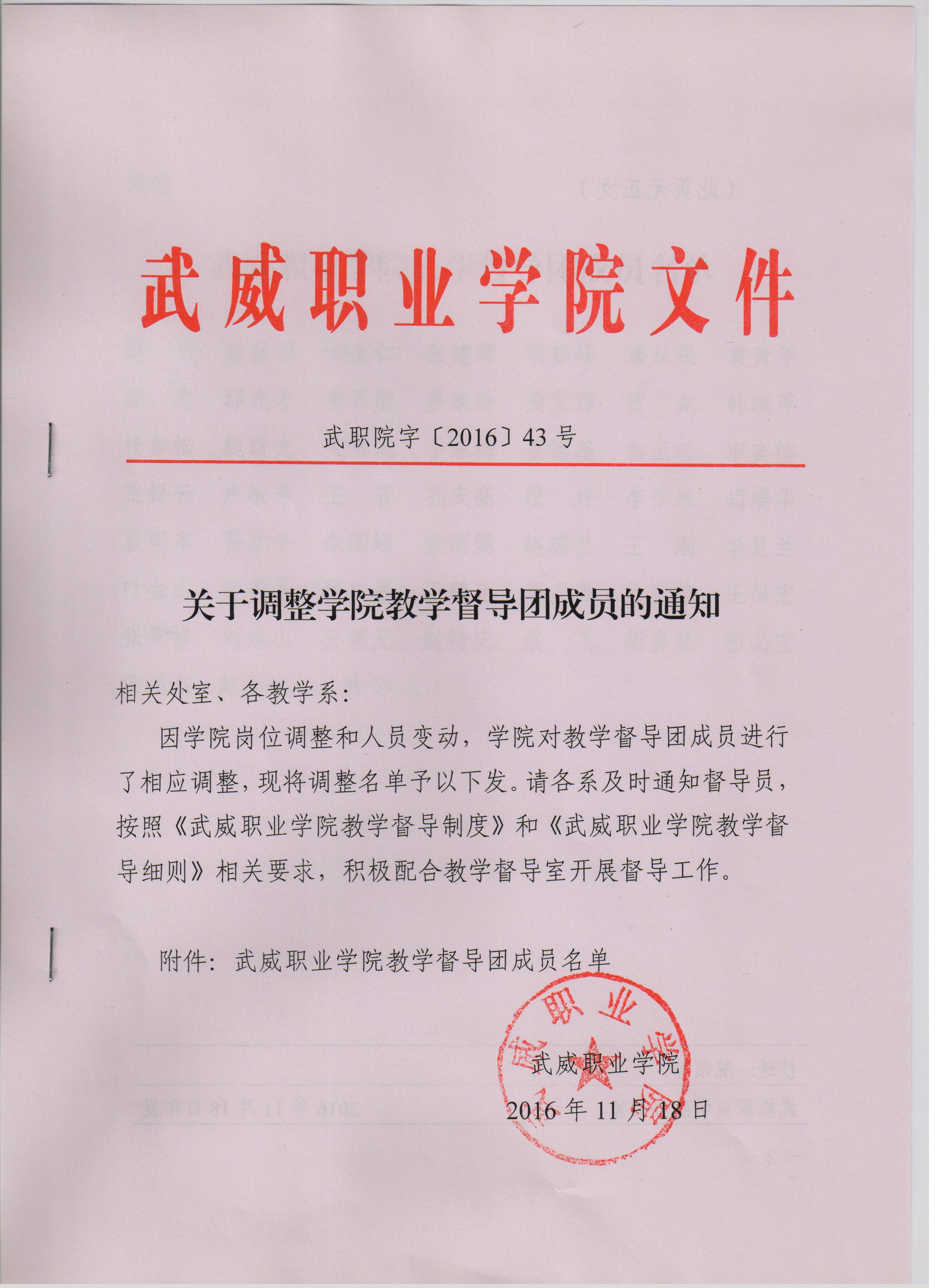 關(guān)于調(diào)整學(xué)院教學(xué)督導(dǎo)團(tuán)成員的通知