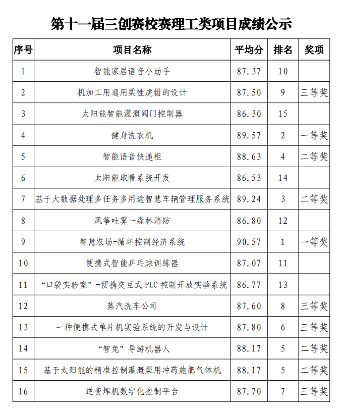 按照第十一屆三創(chuàng)賽省賽組委會(huì)要求,學(xué)院于4月24日在創(chuàng)新創(chuàng)業(yè)中心舉辦了校賽,經(jīng)學(xué)生團(tuán)隊(duì)申報(bào)、現(xiàn)場答辯及專家評(píng)審環(huán)節(jié),校賽已圓滿完成。按照校賽方案,一等獎(jiǎng)不超過參賽隊(duì)數(shù)的 10%,二等獎(jiǎng)不超過參賽隊(duì)數(shù)的 20%,三等獎(jiǎng)不超過參賽隊(duì)數(shù)的 30%?,F(xiàn)將第十一屆三創(chuàng)賽校賽獲獎(jiǎng)項(xiàng)目成績和獲獎(jiǎng)名次予以公示,公示期三日。