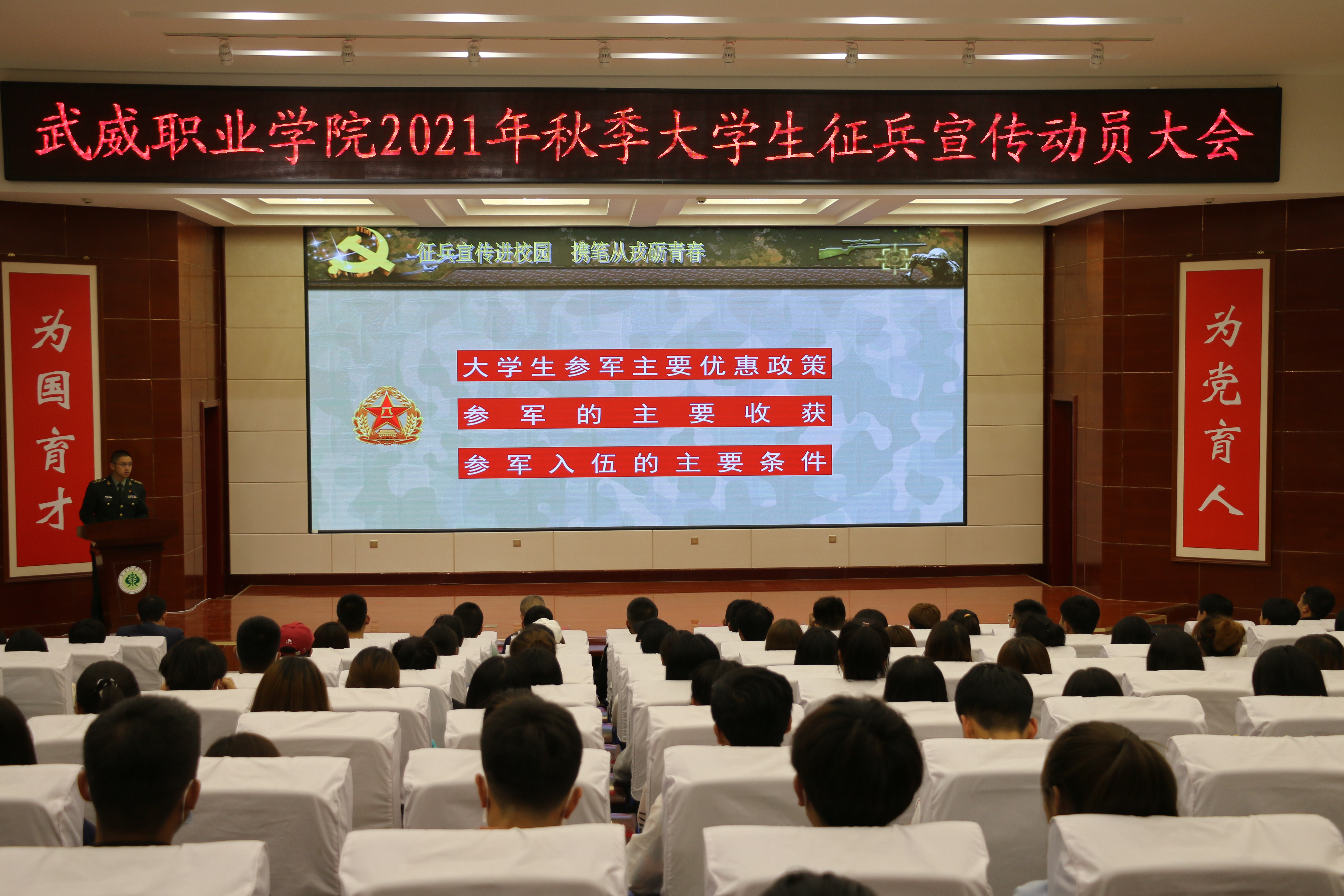 征兵宣傳動(dòng)員大會(huì)上,同學(xué)們觀(guān)看了甘肅省和武威市征兵宣傳片,何志強(qiáng)圍繞征兵優(yōu)撫政策和應(yīng)征報(bào)名條件、程序進(jìn)行了宣講,全方位、多角度向同學(xué)們?cè)敿?xì)介紹了2021年大學(xué)生征兵的入伍流程、應(yīng)征條件、選用培養(yǎng)、優(yōu)惠政策等。