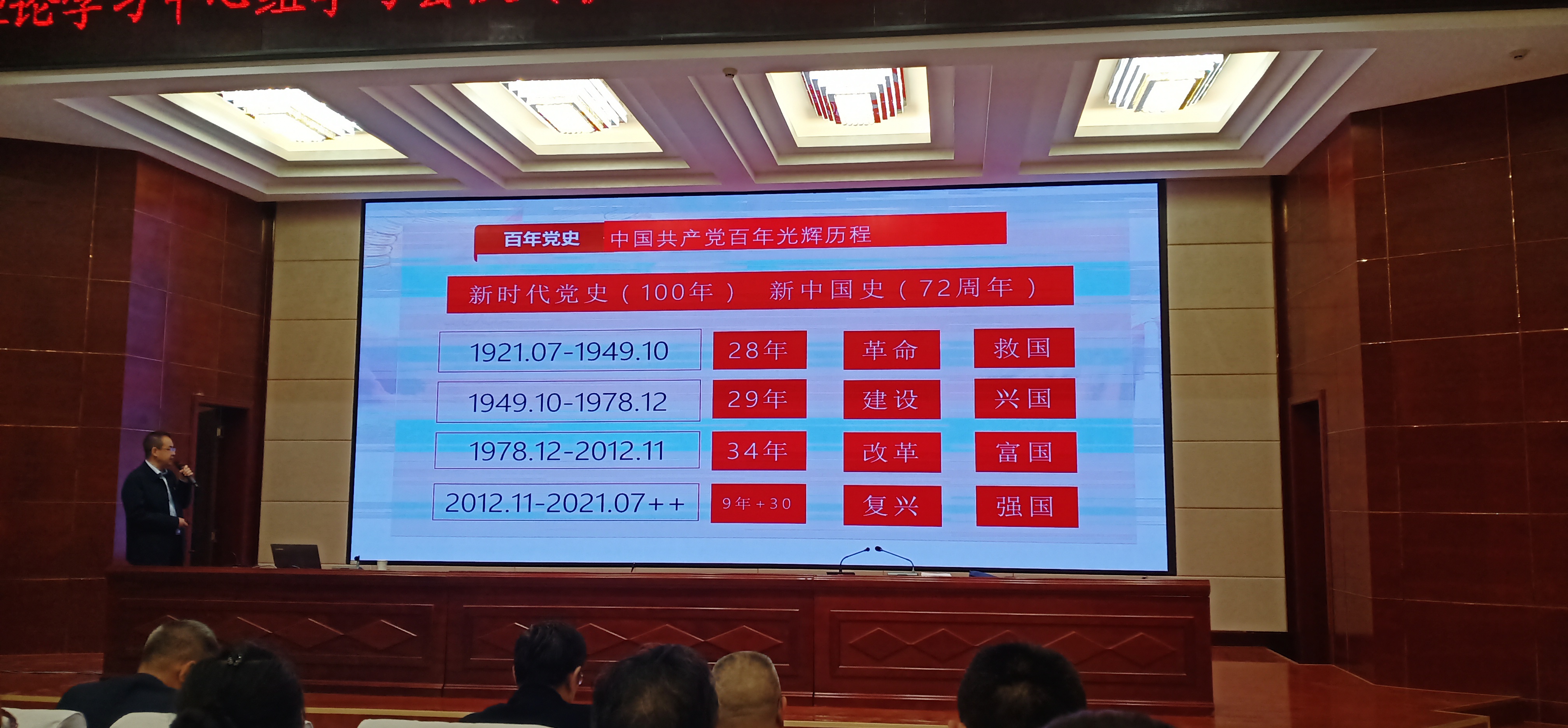 翟存祥教授以《光輝的歷程》為題,詳細(xì)講解了黨的百年歷史分成的四個(gè)歷史時(shí)期、兩大奇跡和只有中國(guó)共產(chǎn)黨才能拯救中國(guó)等內(nèi)容。通過(guò)學(xué)習(xí),黨員教師進(jìn)一步深入了解了中國(guó)共產(chǎn)黨百年黨。