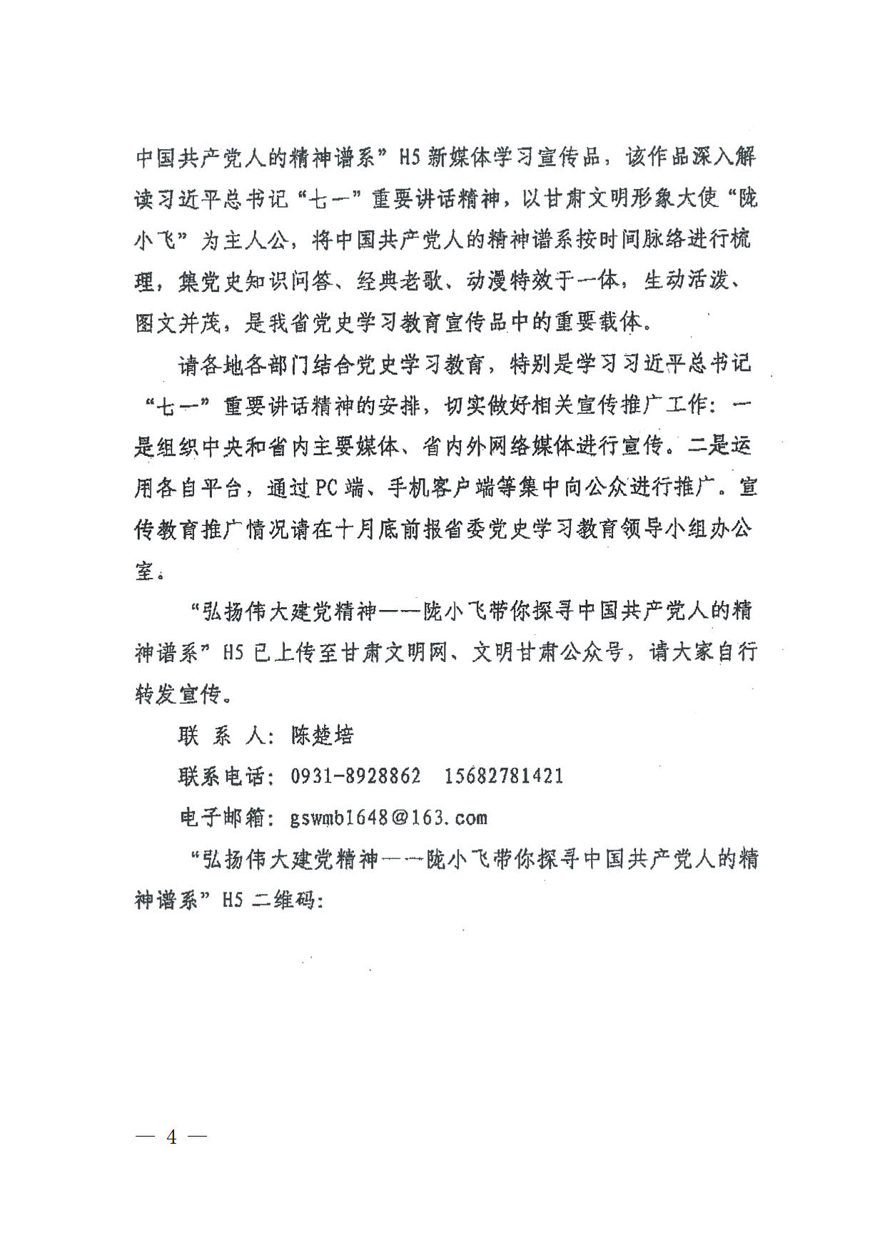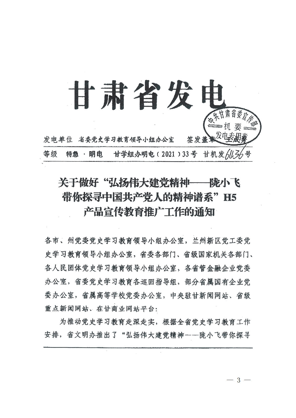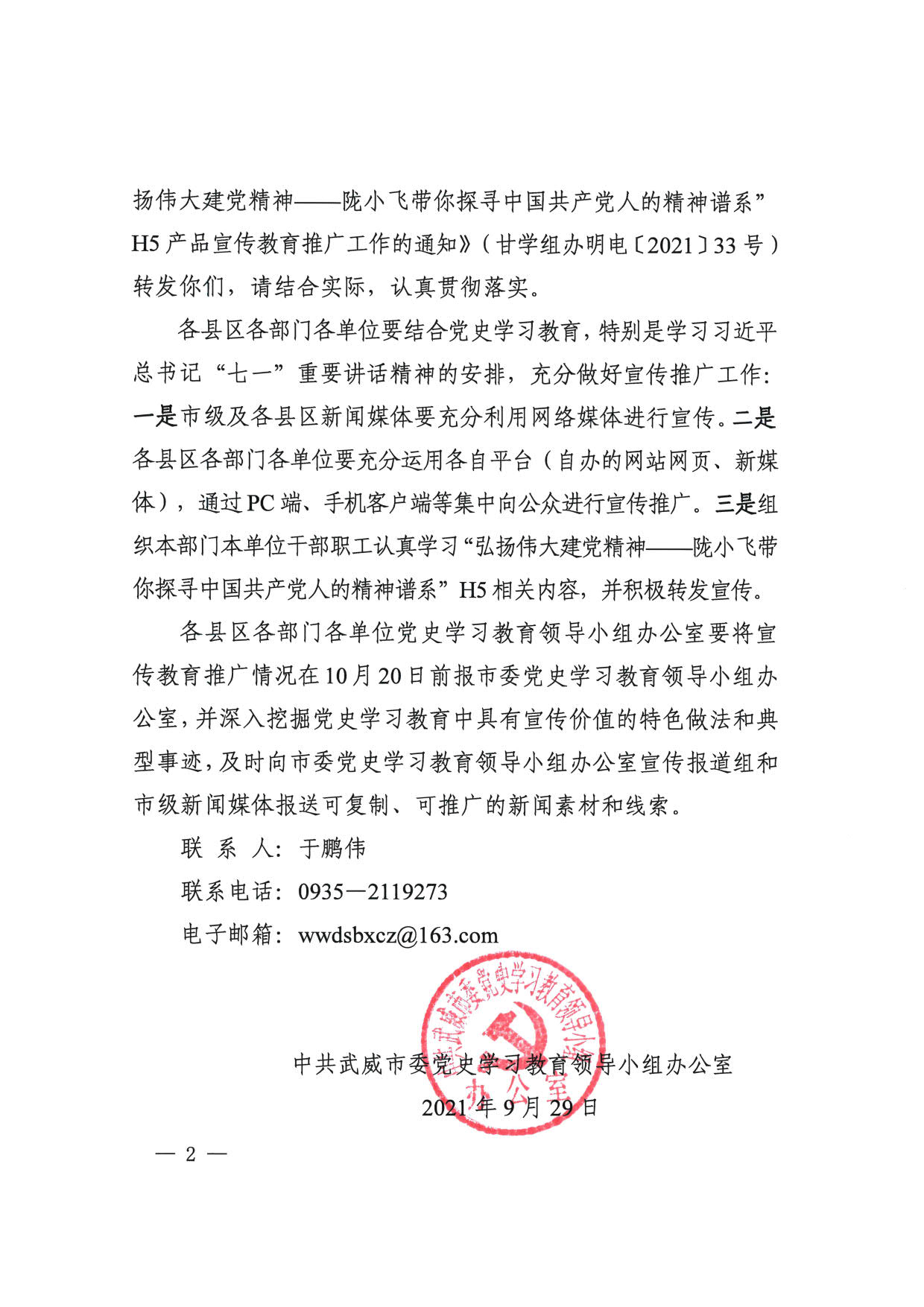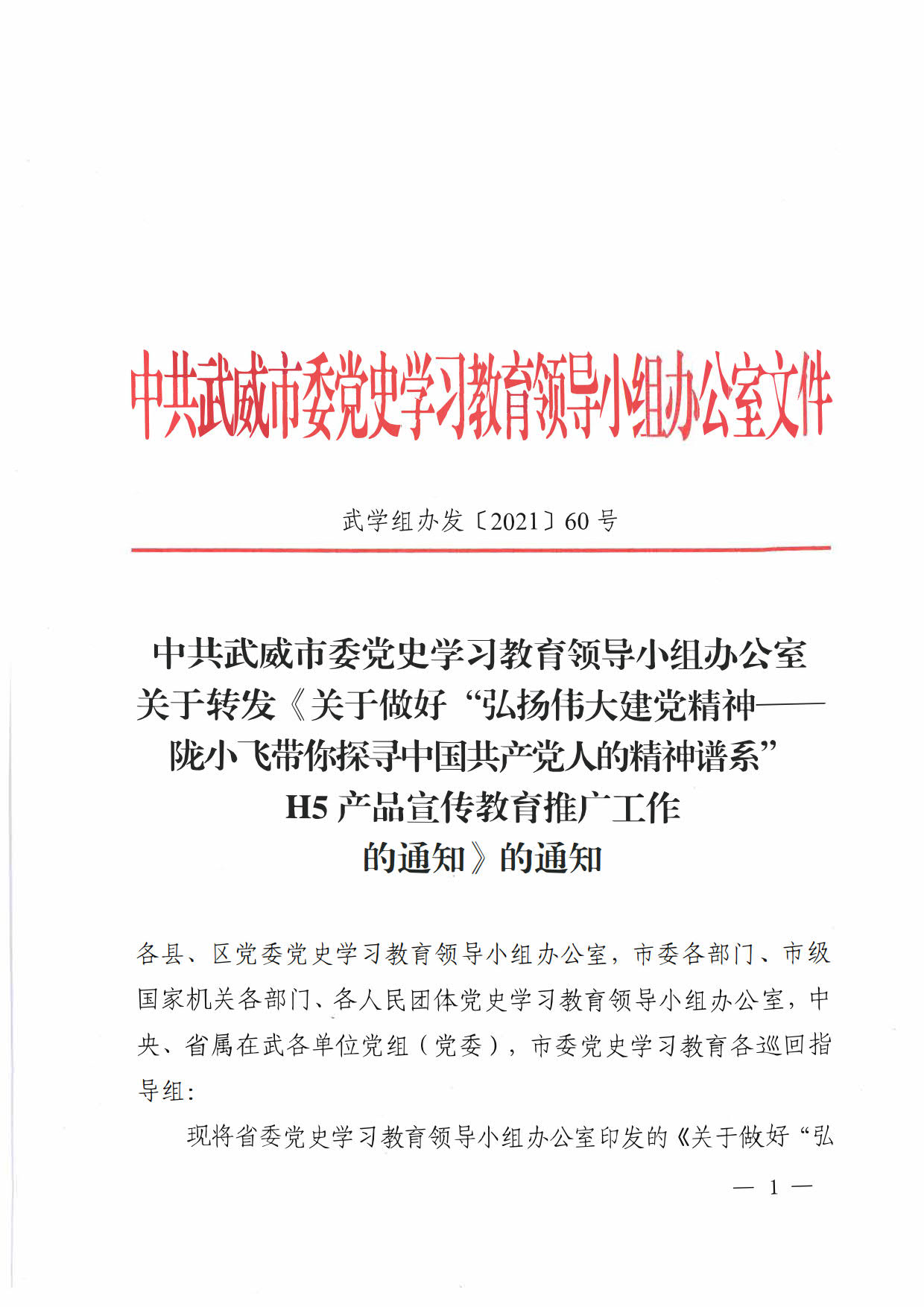 中共武威市委黨史學(xué)習(xí)教育領(lǐng)導(dǎo)小組辦公室關(guān)于轉(zhuǎn)發(fā)〈關(guān)于做好 “弘揚(yáng)偉大建黨精神——隴小飛帶你探尋中國(guó)共產(chǎn)黨人的精神譜系”H5產(chǎn)品宣傳教育推廣工作的通知〉的通知