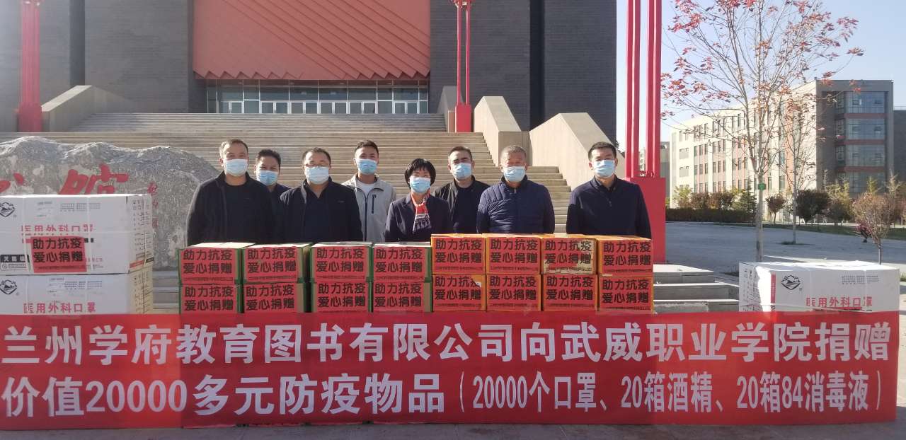 2021年11月4日,武威職業(yè)學院收到蘭州學府教育圖書有限公司捐贈的價值20000多元防疫物品(20000個口罩、20箱酒精、20箱84消毒液)。學院黨委委員、副院長何毅對蘭州學府教育圖書有限公司的慷慨贈送表示感謝,對他們在危難面前勇于擔當、鼎力相助的善舉表示贊揚。她說,目前學校疫情防控在即,消護物品儲備處于緊張狀態(tài),蘭州學府教育圖書有限公司雪中送炭、奉獻愛心,增強了我們打贏這場疫情防控阻擊戰(zhàn)的信心。