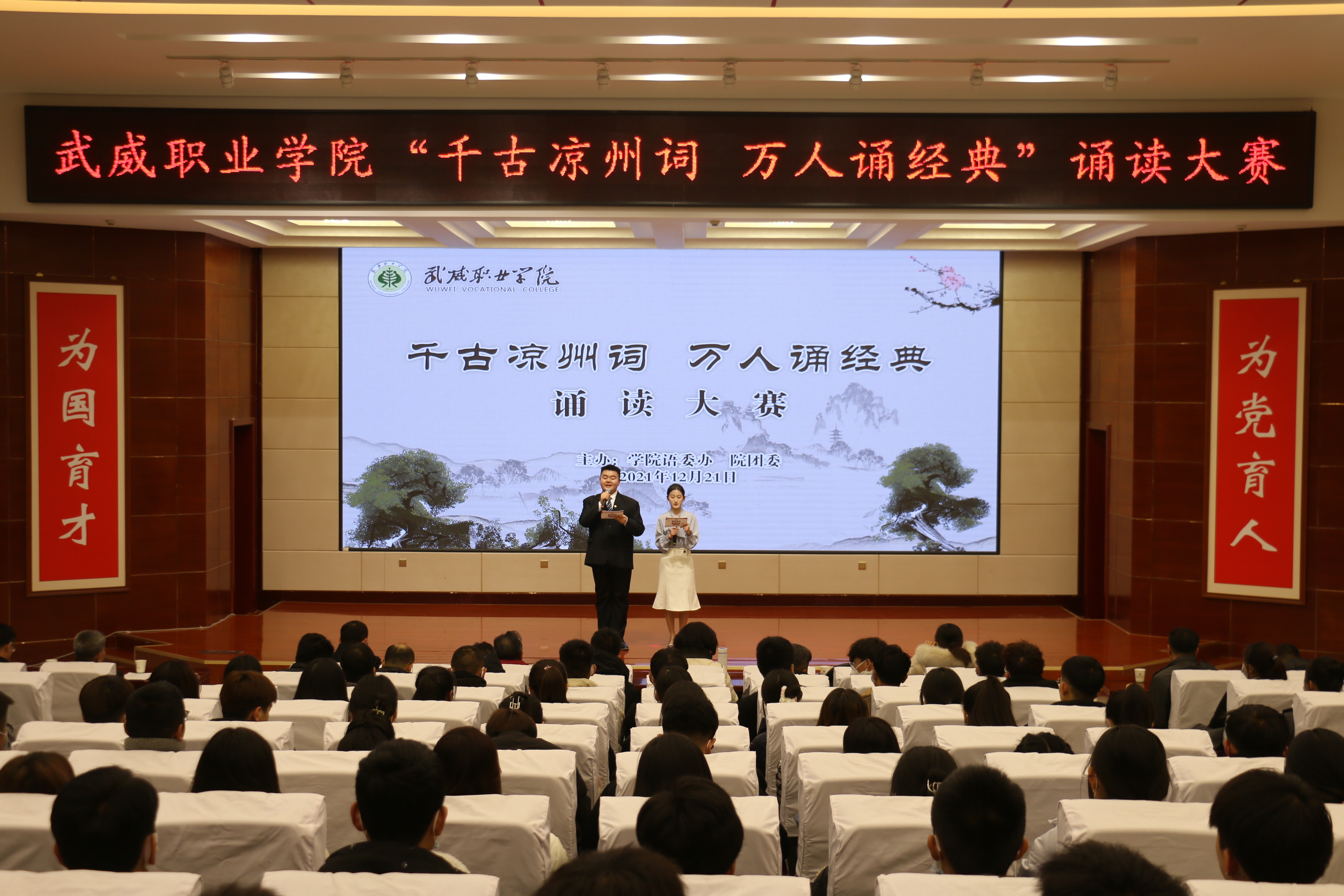 為深化黨史學(xué)習(xí)教育,推進(jìn)“雙高計(jì)劃”建設(shè)任務(wù),弘揚(yáng)涼州文化,傳承絲路精神,助推全國(guó)文明城市創(chuàng)建,營(yíng)造書香校園氛圍,12月21日晚,學(xué)院“千古涼州詞 萬(wàn)人誦經(jīng)典”誦讀大賽在菁英廳舉辦,學(xué)院黨委書記、院長(zhǎng)趙明,黨委委員、副院長(zhǎng)張開禮,黨委委員、副院長(zhǎng)王守云出席活動(dòng),各分團(tuán)委書記及學(xué)生代表250余人觀看比賽。