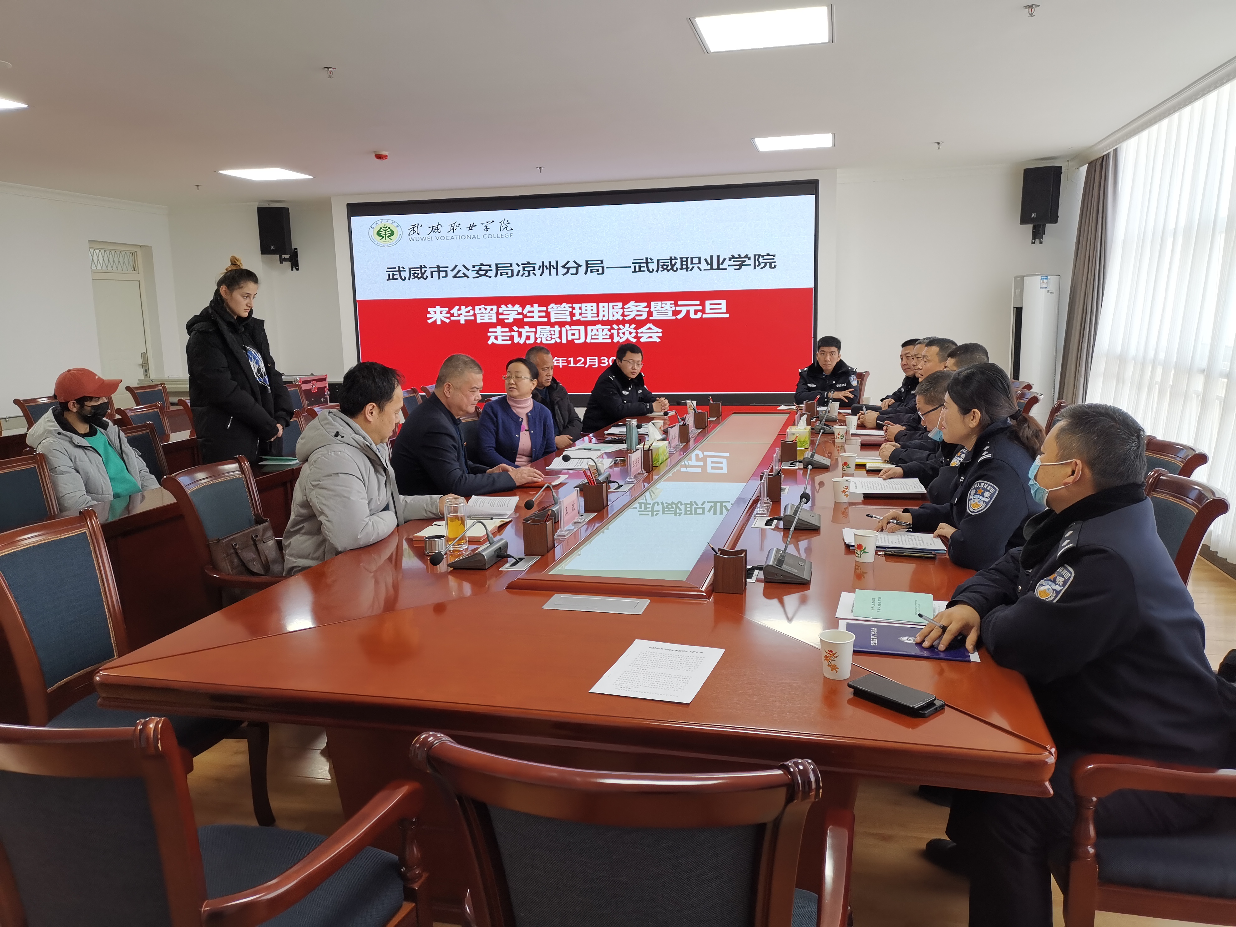12月30日上午,市公安局出入境管理科、非政府組織管理辦公室,市公安局涼州分局國安大隊、反恐大隊、出入境管理辦公室、涼州分局西關街派出所一行十一人到訪學院,開展來華留學生管理服務暨元旦走訪慰問活動。黨委委員、副院長田迎春、王守云出席活動。國際合作與交流處處長潘從民、保衛(wèi)處處長王政及相關人員,2019級、2021級在華留學生參加活動。田迎春主持活動。
