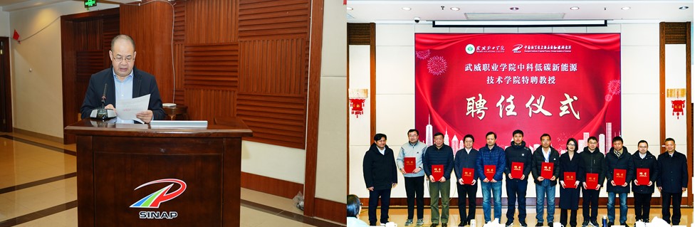 聘任儀式上,學(xué)院黨委副書記翟存祥宣讀了《武威職業(yè)學(xué)院 中國科學(xué)院上海應(yīng)用物理研究所關(guān)于續(xù)聘楊存忠等17名同志擔(dān)任中科低碳新能源技術(shù)學(xué)院特聘教授的通知》。隨后,上海應(yīng)用物理研究所所長戴志敏,學(xué)院黨委書記、院長趙明向17名特聘教授頒發(fā)了聘書。