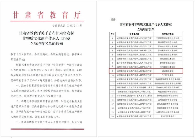 國家級非物質(zhì)文化遺產(chǎn)傳承人、學(xué)校攻鼓子藝術(shù)團(tuán)指導(dǎo)教師楊門元合作申報(bào)的“農(nóng)村非物質(zhì)文化遺產(chǎn)傳承人楊門元工作室”,獲評甘肅省農(nóng)村非物質(zhì)文化遺產(chǎn)傳承人工作室。