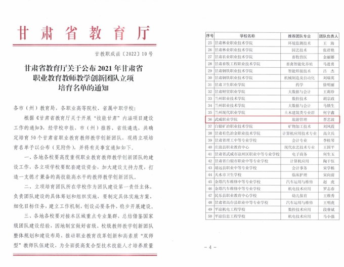 經(jīng)濟(jì)管理學(xué)院晉藝波負(fù)責(zé)的“旅游管理”專業(yè)教學(xué)團(tuán)隊(duì)獲評甘肅省職業(yè)教育教師教學(xué)創(chuàng)新團(tuán)隊(duì)。