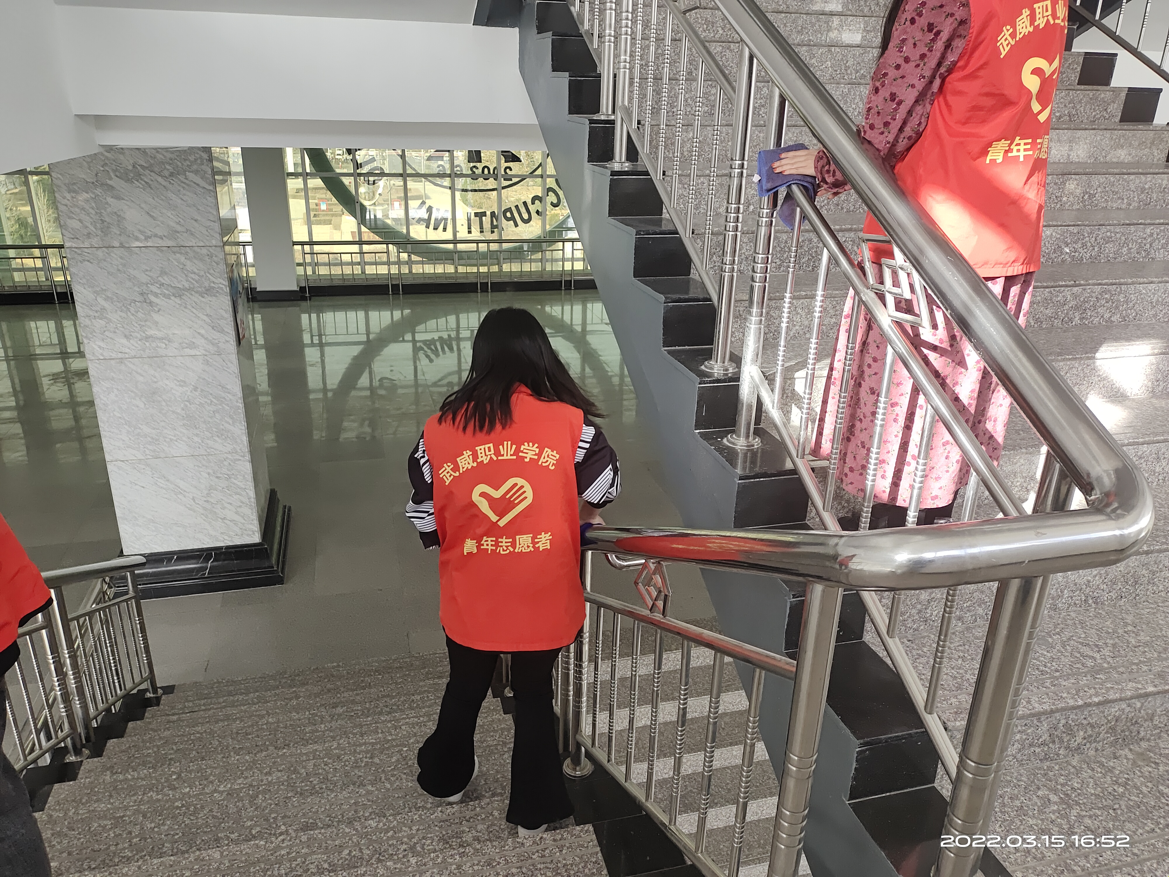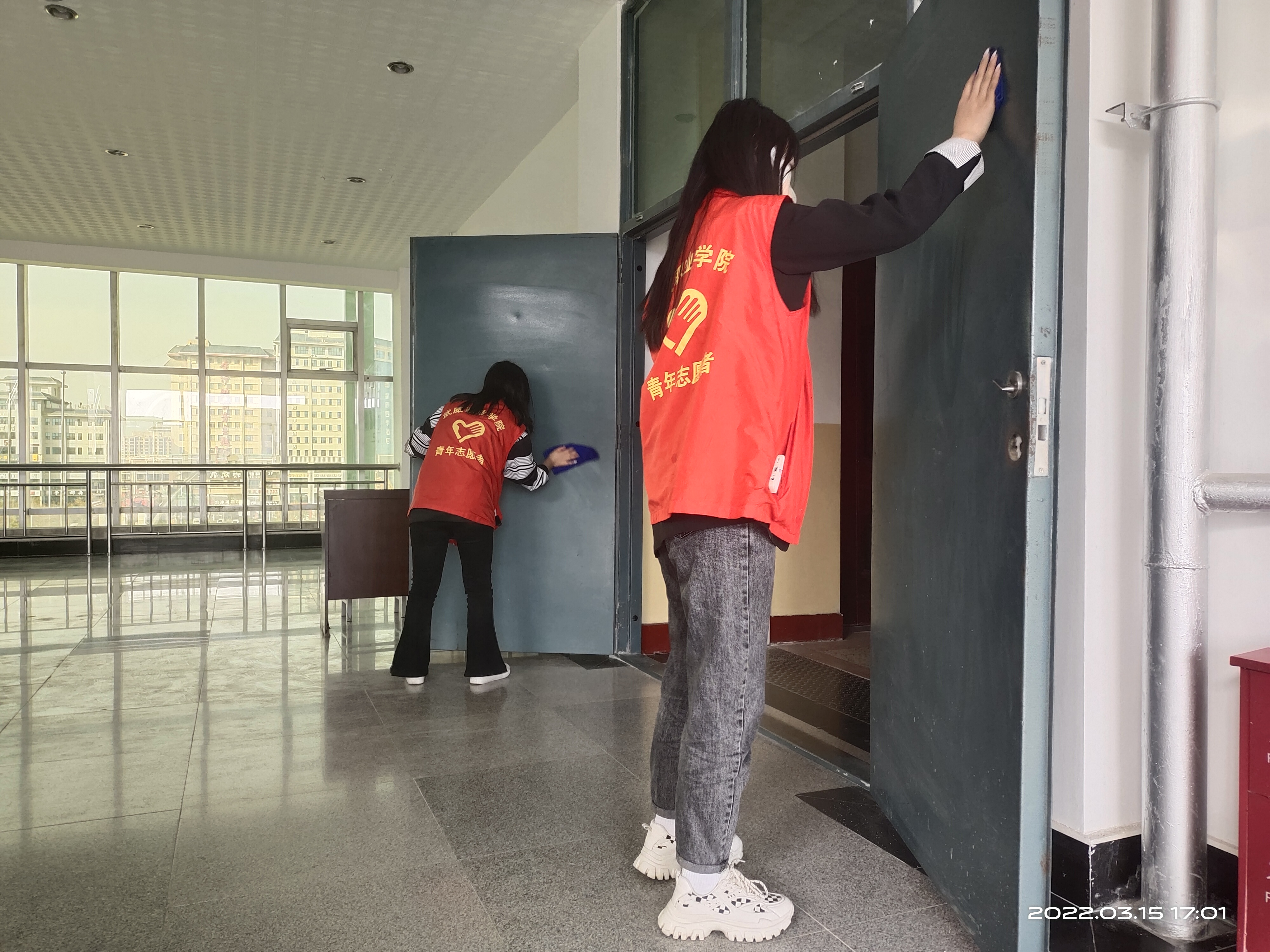 青年志愿者們不僅僅只是一個名義,他們不怕臟,不怕累,穿梭在校園各個角落,他們拿著掃帚、簸箕打掃衛(wèi)生死角,撿煙頭,還有一批在教學樓內(nèi)打掃公共教室的,有的在收拾垃圾,有的在擦黑板。教學樓門口也有他們的身影,在烈日炎炎下擦拭著玻璃,他們這種勇于參與志愿者活動、不怕苦、不怕累的精神值得同學們學習。