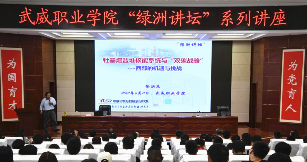 在全院上下深入開展黨史學(xué)習(xí)教育之際,為進(jìn)一步推進(jìn)省級(jí)“雙高計(jì)劃”建設(shè),促進(jìn)中科低碳新能源技術(shù)學(xué)院創(chuàng)新發(fā)展,深化學(xué)院教育教學(xué)改革,6月11日,學(xué)院第45期“綠洲講壇”開講,本次論壇邀請(qǐng)中國科學(xué)院上海應(yīng)用物理研究所研究員、博士生導(dǎo)師兼中國科學(xué)院先進(jìn)核能創(chuàng)新研究院院長徐洪杰為全院師生作題為《基于釷基熔鹽堆的風(fēng)光核儲(chǔ)多能融合系統(tǒng)——西部“雙碳戰(zhàn)略”之路的機(jī)遇和挑戰(zhàn)》的主旨報(bào)告。中國科學(xué)院上海應(yīng)用物理研究所黨委書記、副所長趙明華研究員,武威園區(qū)園區(qū)辦主任趙先堂,聯(lián)合辦學(xué)主管兼中科低碳新能源技術(shù)學(xué)院院長助理米麗娟博士出席,學(xué)院領(lǐng)導(dǎo)班子成員、中層干部、各院系師生代表共220余人參加報(bào)告會(huì)。報(bào)告會(huì)由學(xué)院黨委書記、院長趙明主持。