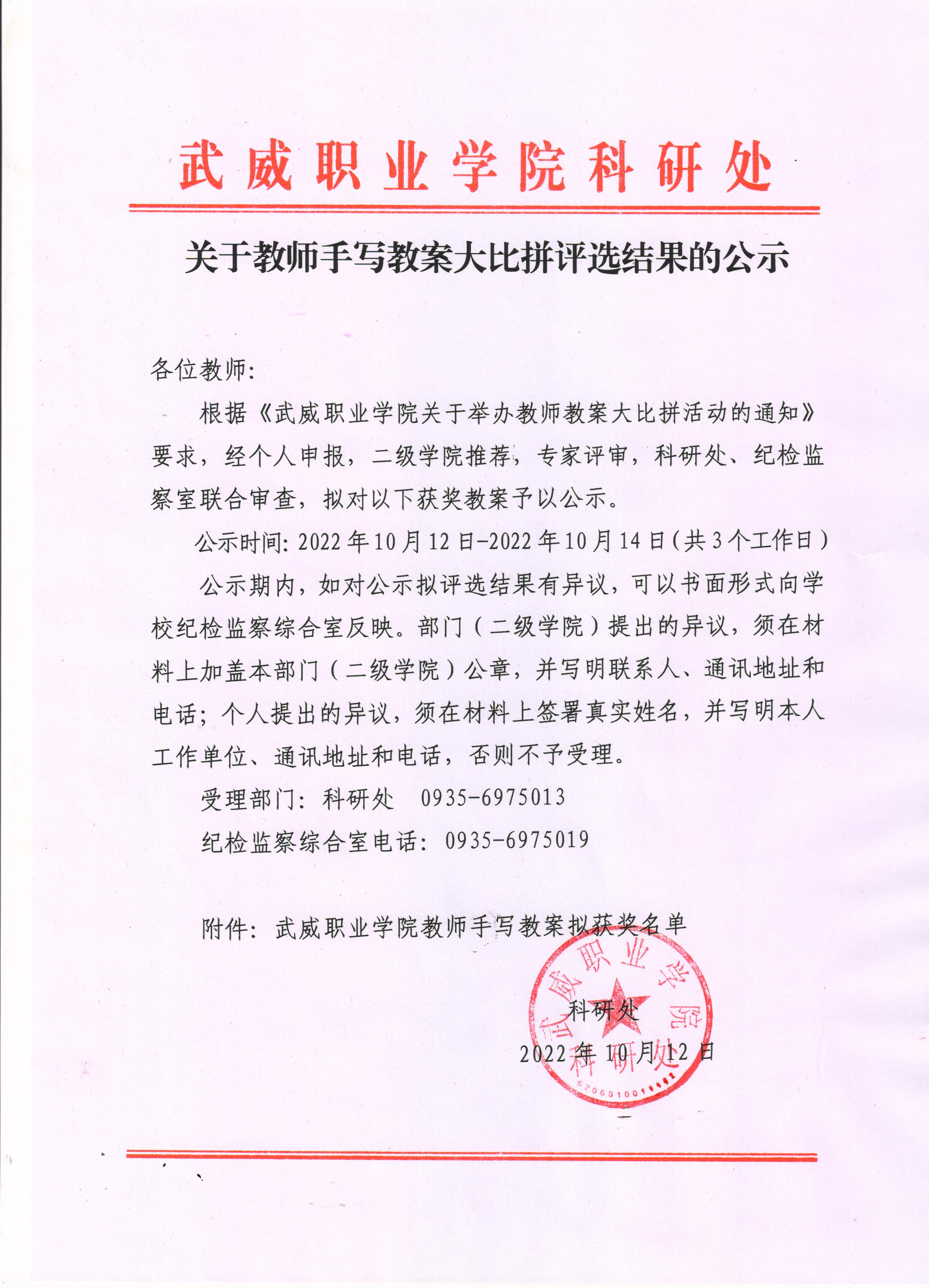 關(guān)于教師手寫(xiě)教案打比賽評(píng)選結(jié)果的公示