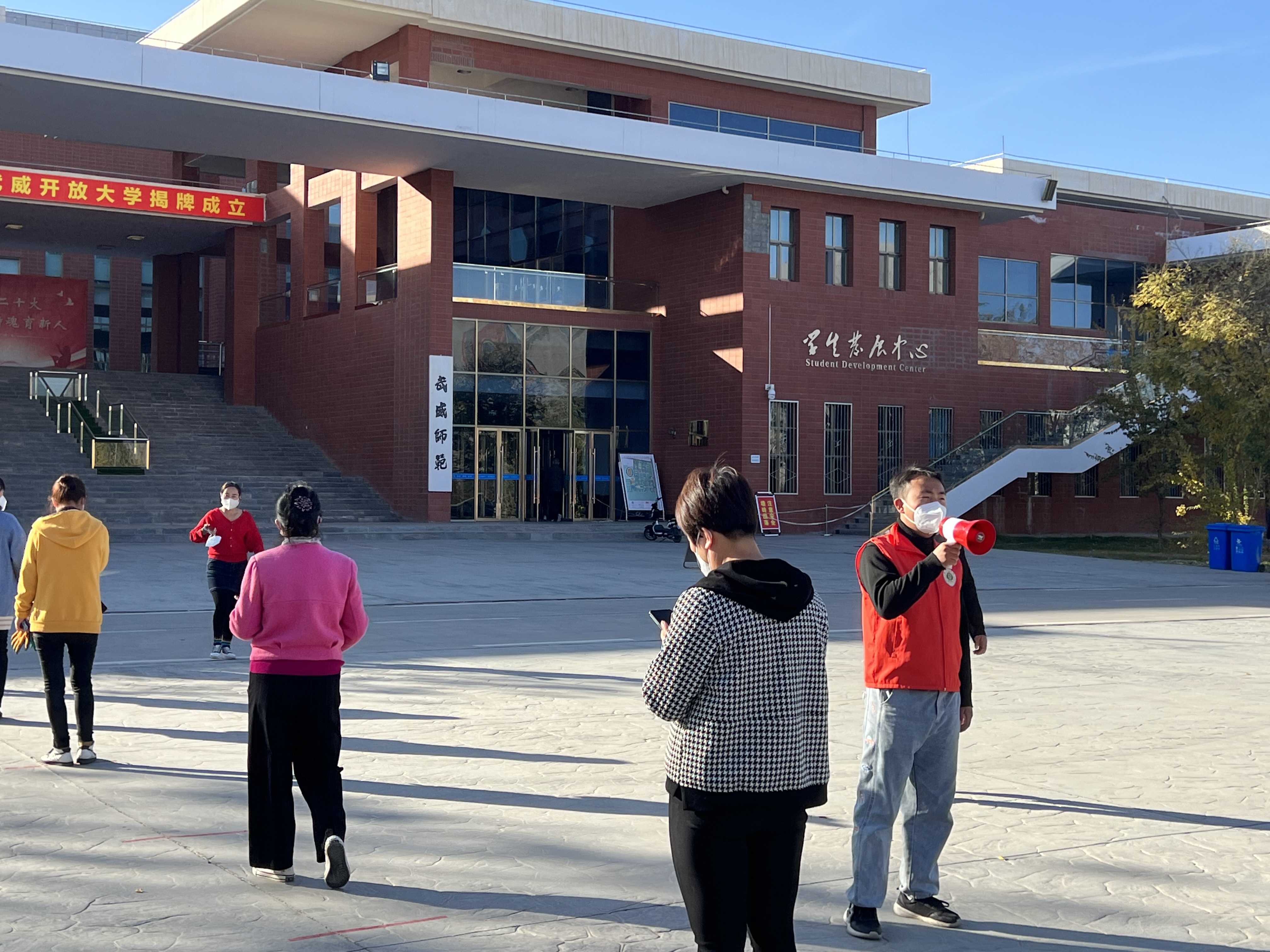 “您好,請(qǐng)測量體溫、掃場所碼?!薄罢?qǐng)佩戴好口罩,有序排隊(duì)……”校學(xué)生會(huì)的陶玲在學(xué)校食堂門口值班時(shí)不停地提醒著進(jìn)出打飯的同學(xué)們,這也是她參加校園疫情防控以來每天講得最多的話。自10月13日涼州區(qū)實(shí)施臨時(shí)管控以來,學(xué)校各學(xué)生組織聞令而動(dòng),身穿“藍(lán)馬甲”積極投身校園疫情防控一線,用奉獻(xiàn)溫暖了這個(gè)秋天。