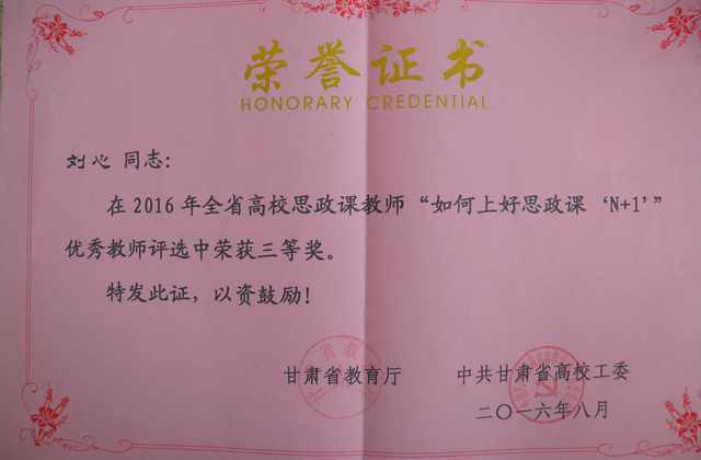根據(jù)《甘肅省教育廳 中共甘肅省高校工委關(guān)于開展“如何上好思政課‘N+1’”優(yōu)秀教師評選活動的通知》要求,我系劉心教師積極參加,最終喜獲由甘肅省教育廳 中共甘肅省高校工委頒發(fā)的在2016年全省高校思政課教師“如何上好思政課‘N+1’”優(yōu)秀教師評選中榮獲三等獎。