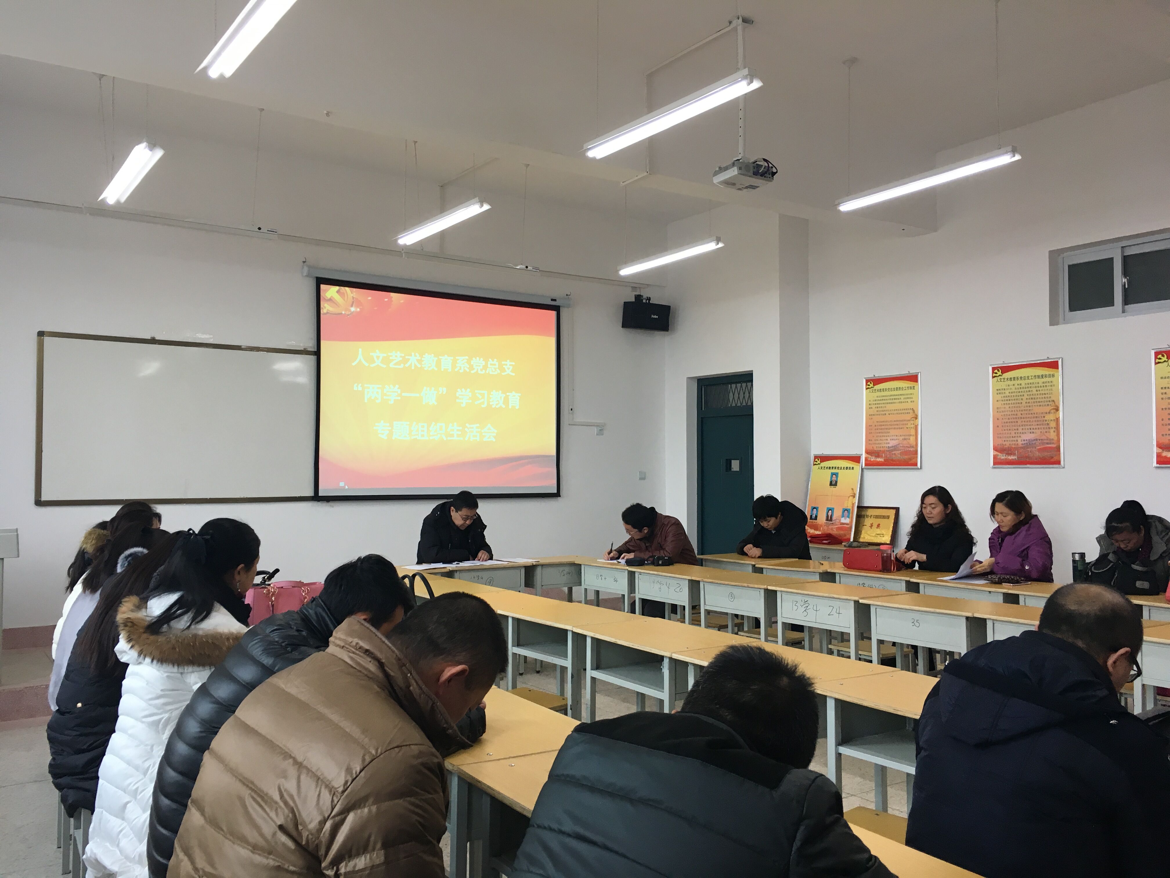 1月10日下午,人文藝術教育系黨總支在勵勤樓403黨員活動室召開了“兩學一做”學習教育專題組織生活會和民主評議黨員大會,會議由系黨總支書記胡靜峰同志主持,全體黨員及部分群眾參加了會議。
