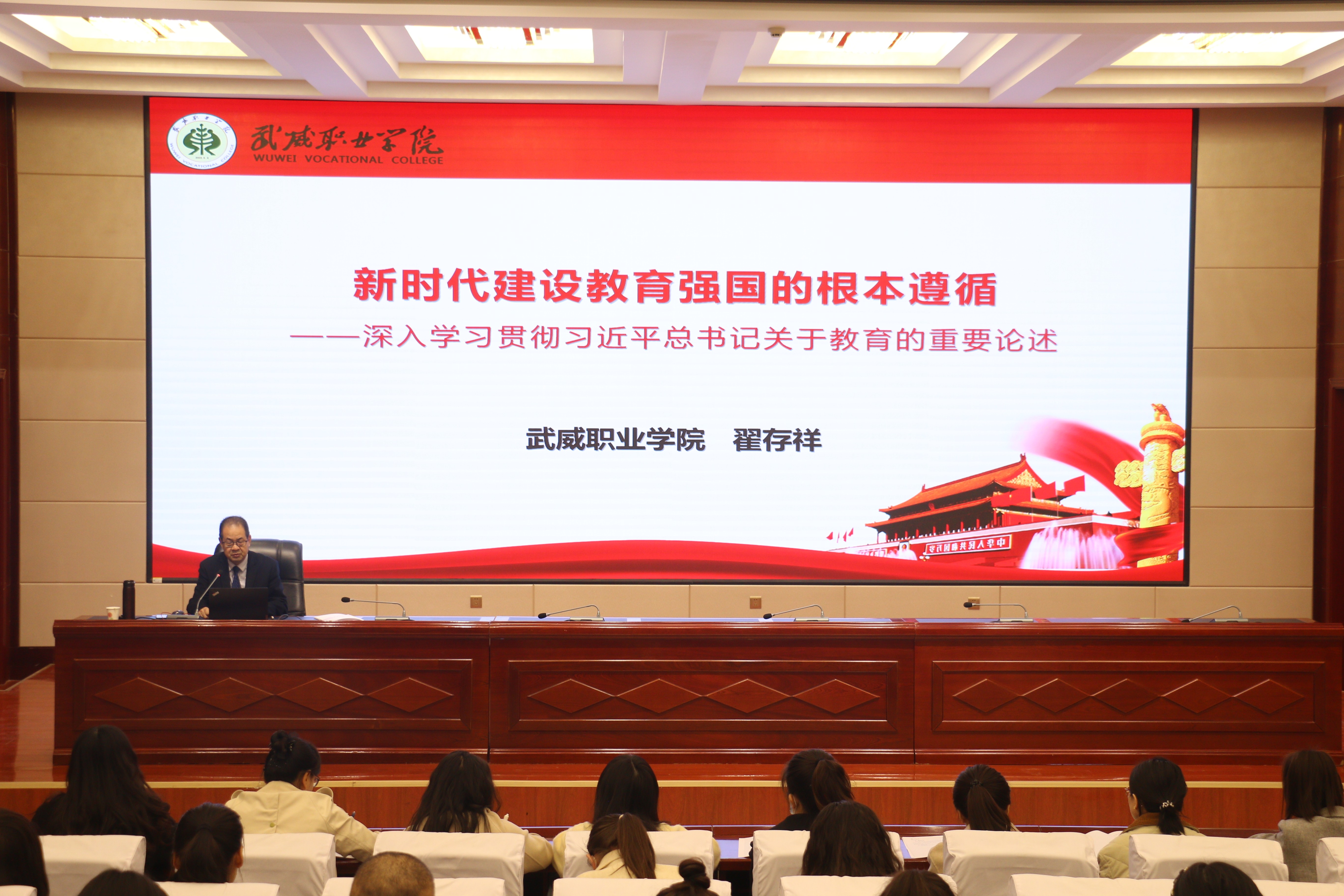 翟存祥代表全體師生對113名新教師成為武威職業(yè)學院大家庭的一員表示熱烈歡迎,并介紹了舉辦此次培訓班的目的。他指出,百年大計,教育為本;教育大計,教師為本;教師大計,師德為本。作為新時代的教師,不要辜負習近平總書記“奮斗創(chuàng)造奇跡、力量源于團結(jié)、希望寄予青年”的殷切希望。同時,他要求新教師要搞清楚“我是誰,從哪里來,到哪里去”;搞清楚我要“干什么、如何干、為誰干”。盡快站穩(wěn)三尺講臺,盡快融入職業(yè)教育,盡快融入這個大家庭,盡快成長為一名合格的、優(yōu)秀的人民教師,在教育教學崗位上立德立功立言。