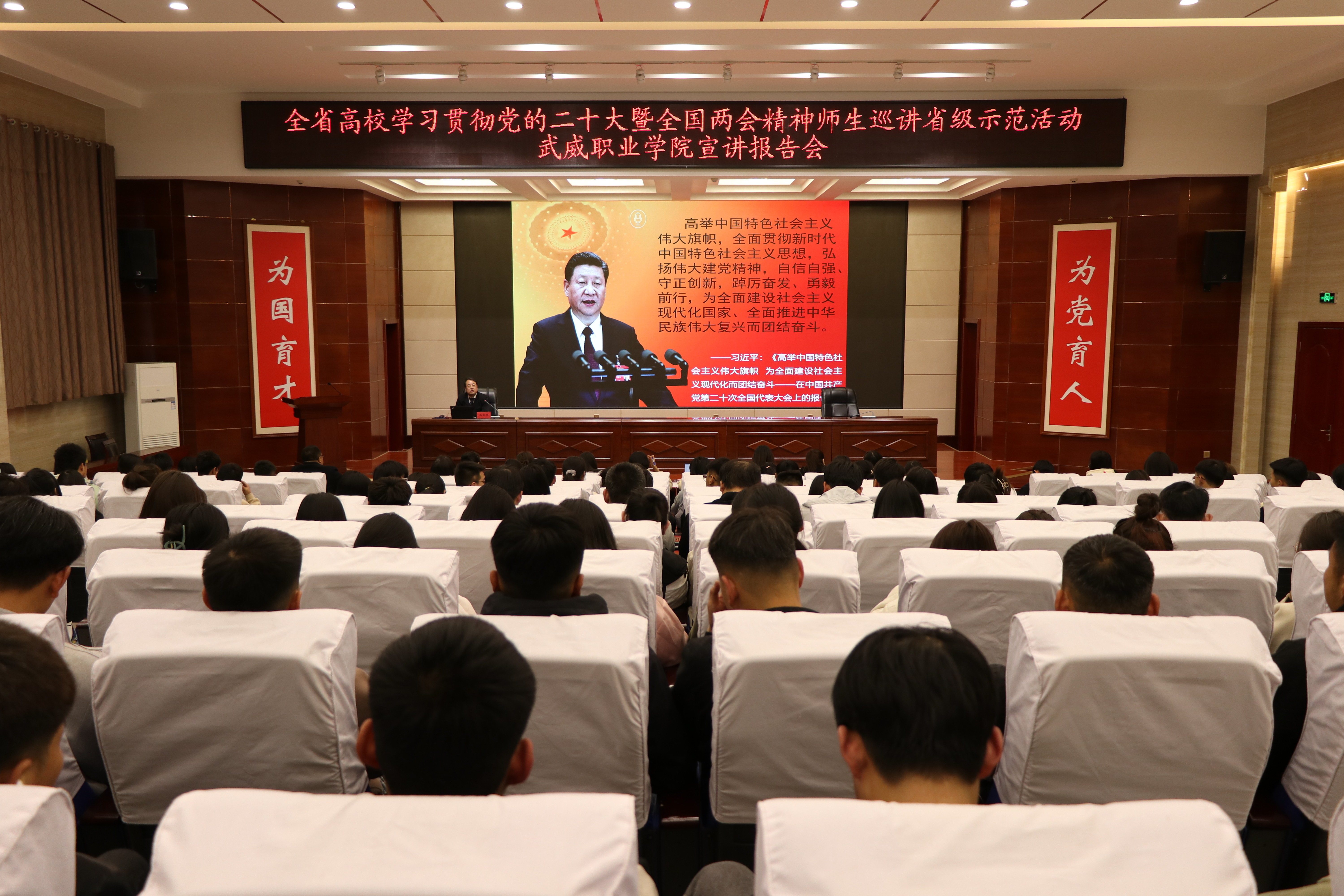 4月23日下午,省委教育工委“逐夢(mèng)新征程 奮斗創(chuàng)未來(lái)”全省高校學(xué)習(xí)貫徹黨的二十大暨全國(guó)兩會(huì)精神師生巡講省級(jí)示范活動(dòng),第五巡講團(tuán)來(lái)我校開(kāi)展宣講。第五巡講團(tuán)組長(zhǎng)、蘭州交通大學(xué)馬克思主義學(xué)院蘇星鴻教授,作了專題報(bào)告。學(xué)校宣傳統(tǒng)戰(zhàn)部全體成員、馬克思主義學(xué)院全體教師、各二級(jí)學(xué)院學(xué)生代表共計(jì)200余人聆聽(tīng)了巡講報(bào)告。