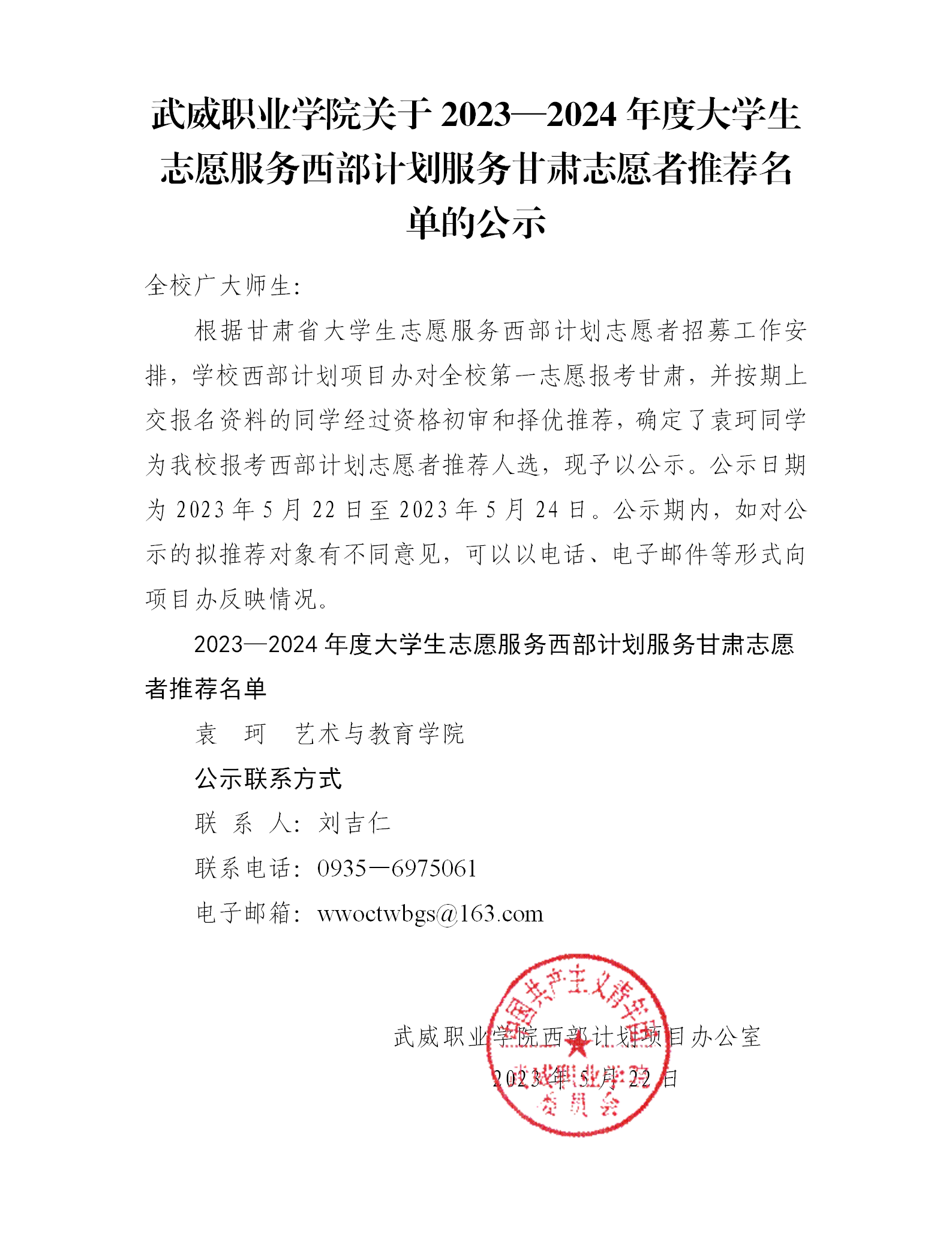 武威職業(yè)學院關(guān)于2023—2024年度大學生志愿服務(wù)西部計劃服務(wù)甘肅志愿者推薦名單的公示