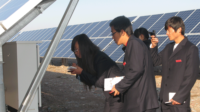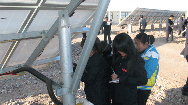 在觀摩學(xué)習(xí)過程中,全體師生受到了園區(qū)管委會(huì)工作人員的熱情接待,管委會(huì)張國偉主任帶領(lǐng)師生參觀了中節(jié)能甘肅武威太陽能發(fā)電有限公司,公司負(fù)責(zé)人向大家介紹了園區(qū)建設(shè)情況,從多晶硅、單晶硅的提煉、太陽能電池板的生產(chǎn)制造到光伏電站的建設(shè),對(duì)光伏發(fā)電產(chǎn)業(yè)鏈進(jìn)行了較詳盡的講述。同學(xué)們看到園區(qū)內(nèi)一排排整齊擺置的太陽能電池板方陣時(shí),都流露出激動(dòng)崇敬的神情,一個(gè)個(gè)邊走邊看,并伸手觸摸太陽能電池板。同學(xué)們就光伏發(fā)電的原理、電池使用壽命、光電轉(zhuǎn)換效率以及光伏電站的運(yùn)行維護(hù)等方面的專業(yè)知識(shí)向負(fù)責(zé)人請(qǐng)教,面對(duì)大家的疑問,園區(qū)負(fù)責(zé)人都耐心細(xì)致的做了解答。