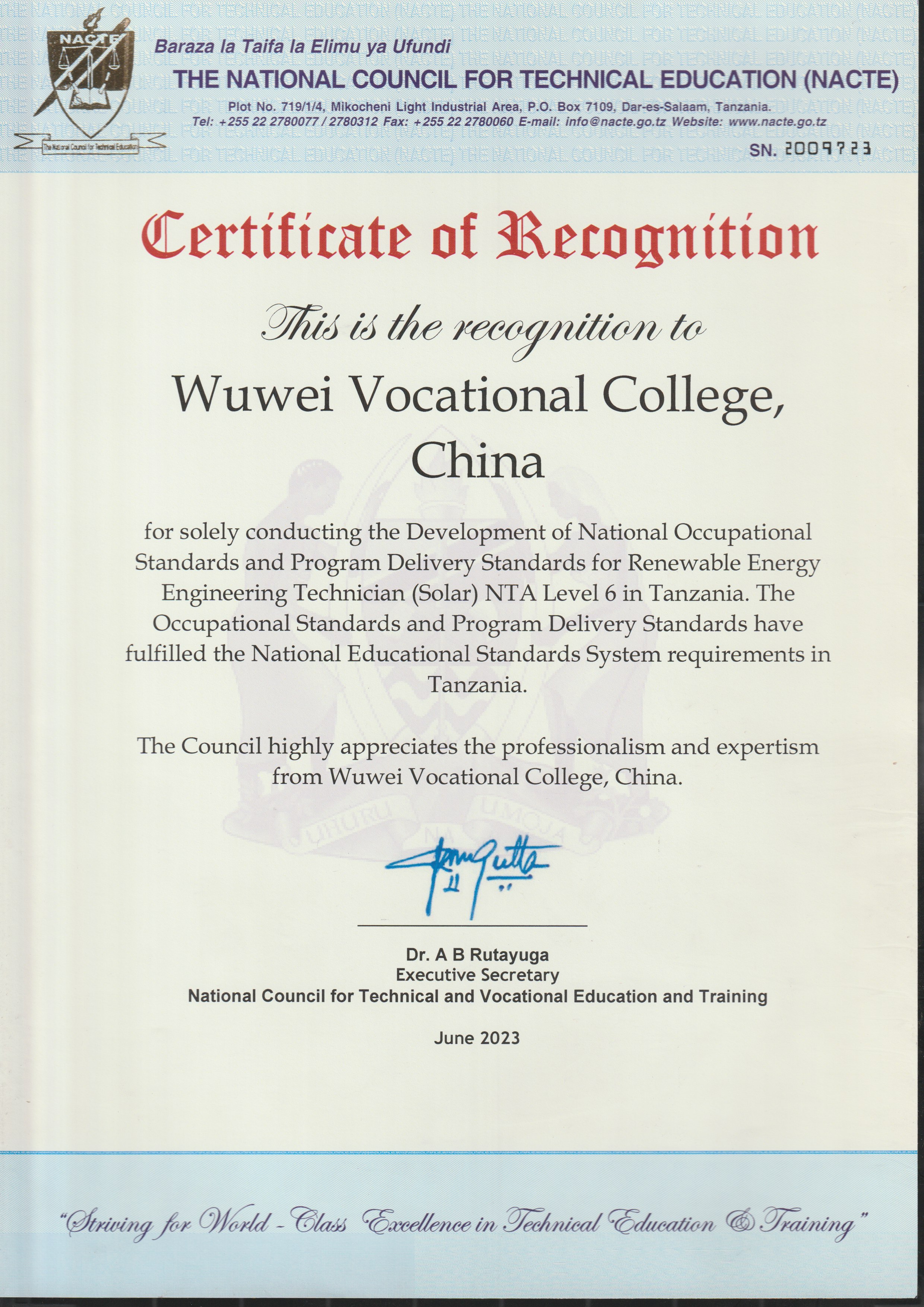 【熱烈祝賀】新能源工程技術(shù)員(太陽能)6級(jí)職業(yè)標(biāo)準(zhǔn)和配套專業(yè)教學(xué)標(biāo)準(zhǔn)通過坦桑尼亞國家職業(yè)教育委員會(huì)審核獲得認(rèn)證!